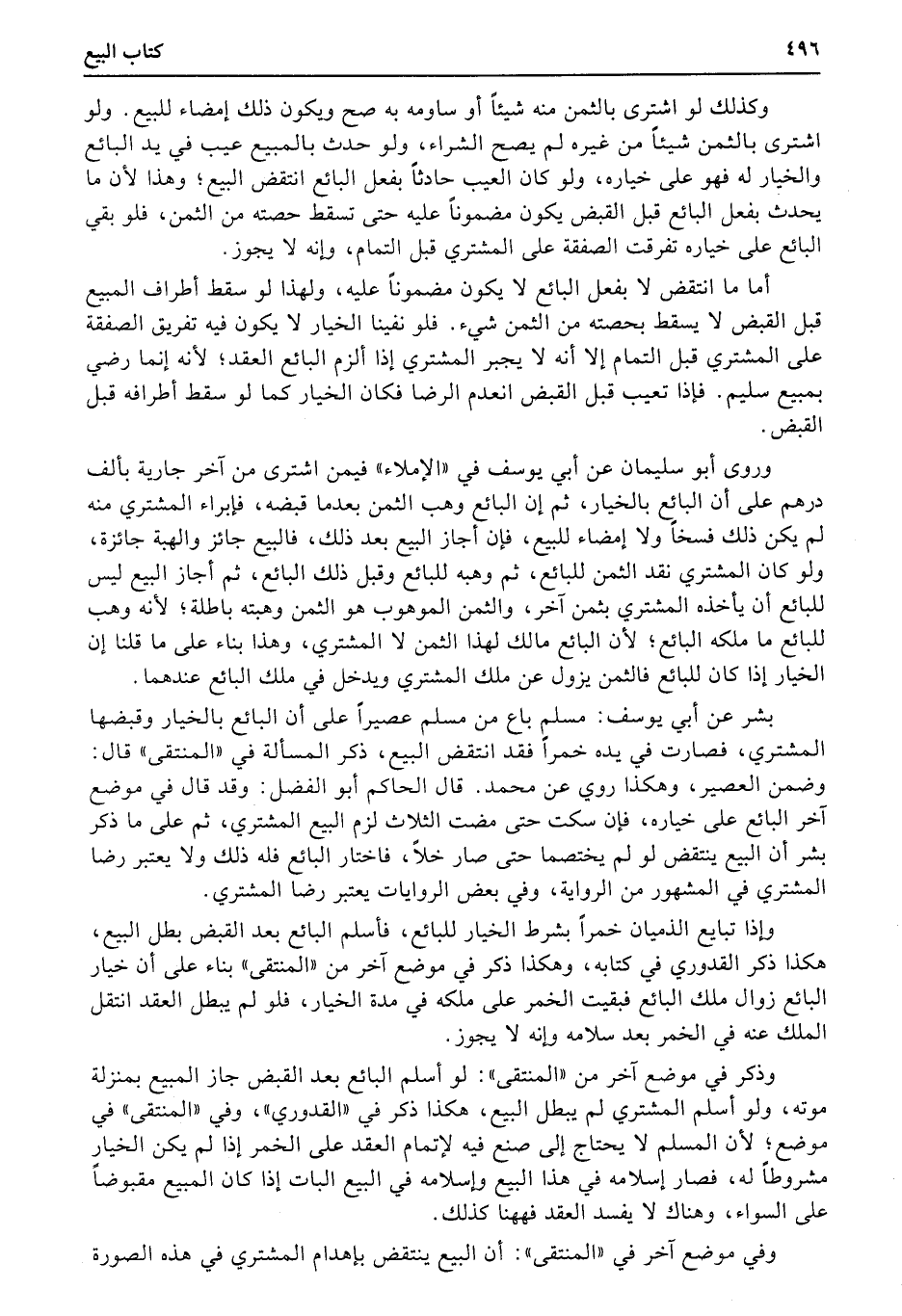 وذكر في موضع آخر من «المنتقى» : لو أسلم البائع بعد القبض جاز المبيع بمنزلة موته، ولو أسلم المشتري لم يبطل البيع، هكذا ذكر في «القدوري» ، وفي «المنتقى» في موضع؛ لأن المسلم لا يحتاج إلى صنع فيه لإتمام العقد على الخمر إذا لم يكن الخيار مشروطاً له، فصار إسلامه في هذا البيع وإسلامه في البيع البات إذا كان المبيع مقبوضاً على السواء، وهناك لا يفسد العقد فههنا كذلك.