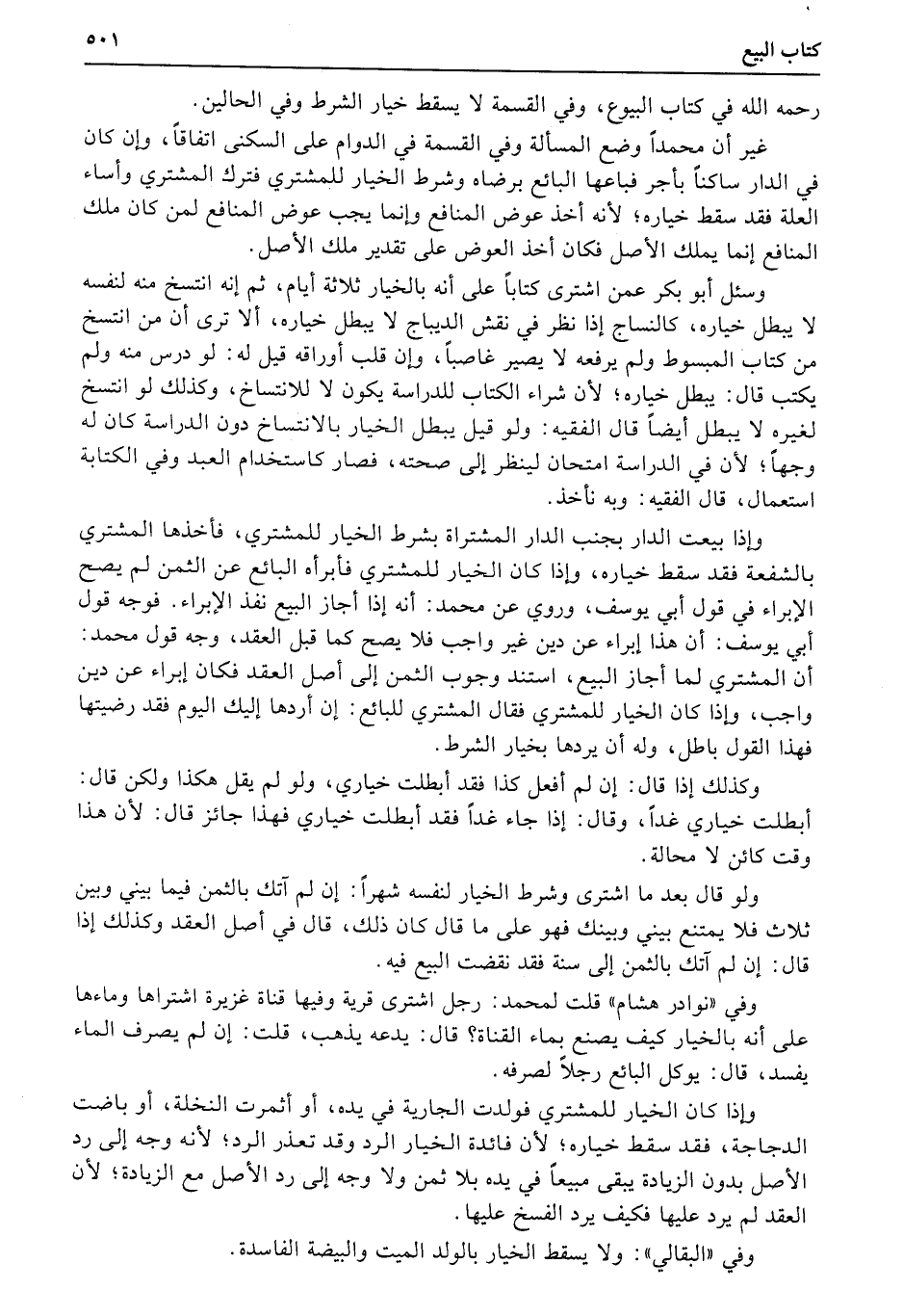وسئل أبو بكر عمن اشترى كتاباً على أنه بالخيار ثلاثة أيام، ثم إنه انتسخ منه لنفسه لا يبطل خياره، كالنساج إذا نظر في نقش الديباج لا يبطل خياره، ألا ترى أن من انتسخ من كتاب المبسوط ولم يرفعه لا يصير غاصباً، وإن قلب أوراقه قيل له: لو درس منه ولم يكتب قال: يبطل خياره؛ لأن شراء الكتاب للدراسة يكون لا للانتساخ، وكذلك لو انتسخ لغيره لا يبطل أيضاً قال الفقيه: ولو قيل يبطل الخيار بالانتساخ دون الدراسة كان له وجهاً؛ لأن في الدراسة امتحان لينظر إلى صحته، فصار كاستخدام العبد وفي الكتابة استعمال، قال الفقيه: وبه نأخذ.