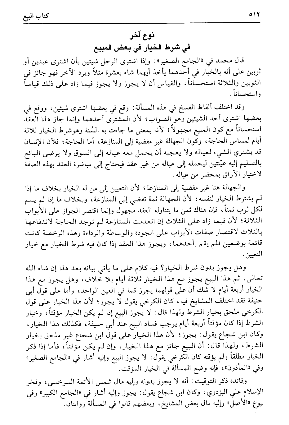 وهل يجوز بدون شرط الخيار؟ فيه كلام على ما يأتي بيانه بعد هذا إن شاء الله تعالى، ثم هذا البيع يجوز مع هذا الخيار ثلاثة أيام بلا خلاف، وهل يجوز مع هذا الخيار أربعة أيام لا شك أن على قولهما يجوز كما في العين الواحد، وأما على قول أبي حنيفة فقد اختلف المشايخ فيه، كان الكرخي يقول لا يجوز؛ لأن هذا الخيار على قول الكرخي ملحق بخيار الشرط ولهذا قال: لا يجوز البيع إذا لم يكن الخيار مؤقتاً، وخيار الشرط إذا كان مؤقتاً أربعة أيام يوجب فساد البيع عند أبي حنيفة، فكذلك هذا الخيار، وكان ابن شجاع يقول: يجوز؛ لأن هذا الخيار على قول ابن شجاع غير ملحق بخيار الشرط، ولهذا قال: أن البيع جائز مع هذا الخيار، وإن لم يكن مؤقتاً، فأما إذا ذكر الخيار مطلقاً ولم يؤقته كان الكرخي يقول: لا يجوز البيع وإليه أشار في «الجامع الصغير» وفي «المأذون» ، فإنه وضع المسألة في الخيار المؤقت.