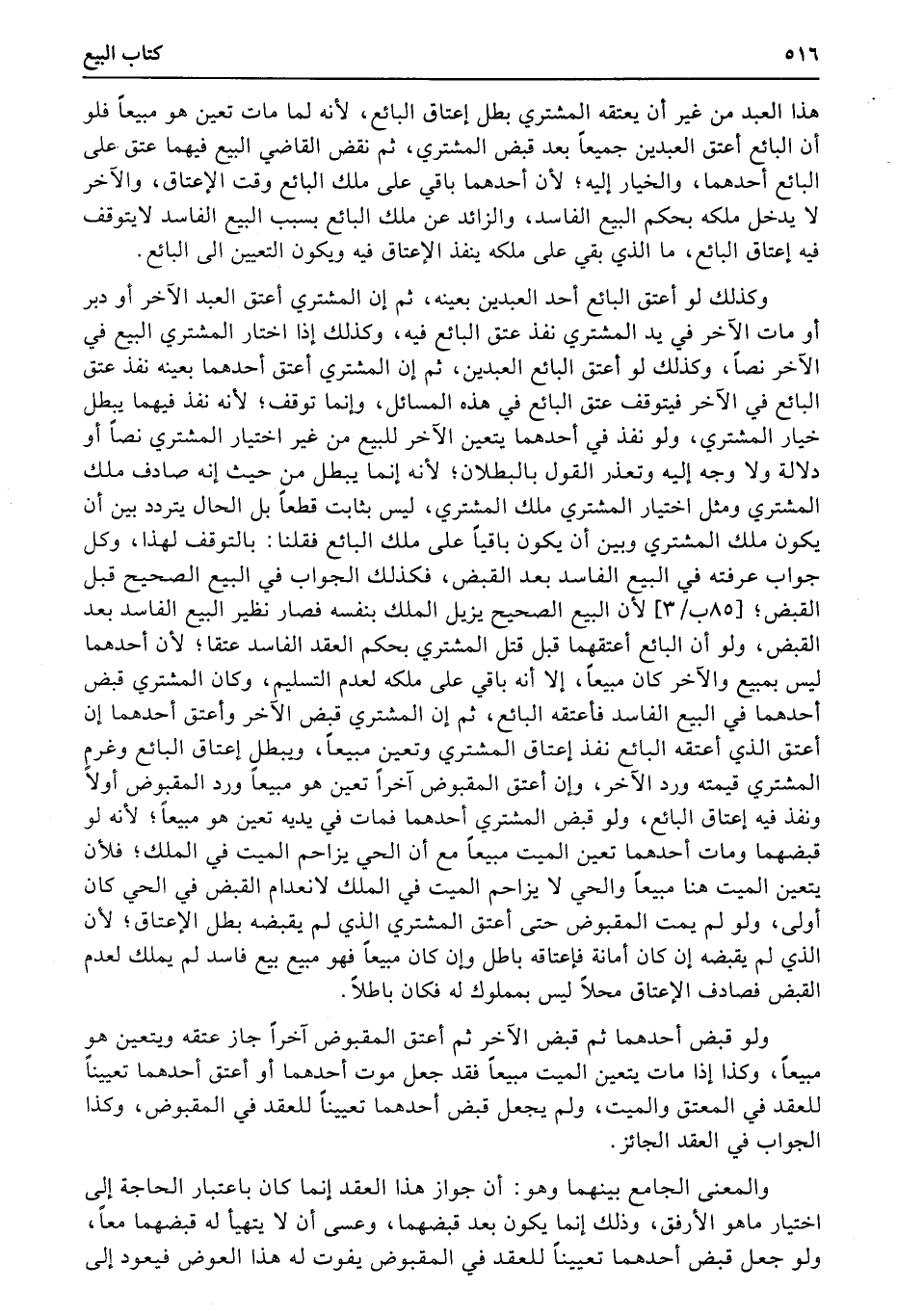 وكذلك لو أعتق البائع أحد العبدين بعينه، ثم إن المشتري أعتق العبد الآخر أو دبر أو مات الآخر في يد المشتري نفذ عتق البائع فيه، وكذلك إذا اختار المشتري البيع في الآخر نصاً، وكذلك لو أعتق البائع العبدين، ثم إن المشتري أعتق أحدهما بعينه نفذ عتق البائع في الآخر فيتوقف عتق البائع في هذه المسائل، وإنما توقف؛ لأنه نفذ فيهما يبطل خيار المشتري، ولو نفذ في أحدهما يتعين الآخر للبيع من غير اختيار المشتري نصاً أو دلالة ولا وجه إليه وتعذر القول بالبطلان؛ لأنه إنما يبطل من حيث إنه صادف ملك المشتري ومثل اختيار المشتري ملك المشتري، ليس بثابت قطعاً بل الحال يتردد بين أن يكون ملك المشتري وبين أن يكون باقياً على ملك البائع فقلنا: بالتوقف لهذا، وكل جواب عرفته في البيع الفاسد بعد القبض، فكذلك الجواب في البيع الصحيح قبل القبض؛ (85ب3) لأن البيع الصحيح يزيل الملك بنفسه فصار نظير البيع الفاسد بعد القبض، ولو أن البائع أعتقهما قبل قتل المشتري بحكم العقد الفاسد عتقا؛ لأن أحدهما ليس بمبيع والآخر كان مبيعاً، إلا أنه باقي على ملكه لعدم التسليم، وكان المشتري قبض أحدهما في البيع الفاسد فأعتقه البائع، ثم إن المشتري قبض الآخر وأعتق أحدهما إن أعتق الذي أعتقه البائع نفذ إعتاق المشتري وتعين مبيعاً، ويبطل إعتاق البائع وغرم المشتري قيمته ورد الآخر، وإن أعتق المقبوض آخراً تعين هو مبيعاً ورد المقبوض أولاً ونفذ فيه إعتاق البائع، ولو قبض المشتري أحدهما فمات في يديه تعين هو مبيعاً؛ لأنه لو قبضهما ومات أحدهما تعين الميت مبيعاً مع أن الحي يزاحم الميت في الملك؛ فلأن يتعين الميت هنا مبيعاً والحي لا يزاحم الميت في الملك لانعدام القبض في الحي كان أولى، ولو لم يمت المقبوض حتى أعتق المشتري الذي لم يقبضه بطل الإعتاق؛ لأن الذي لم يقبضه إن كان أمانة فإعتاقه باطل وإن كان مبيعاً فهو مبيع بيع فاسد لم يملك لعدم القبض فصادف الإعتاق