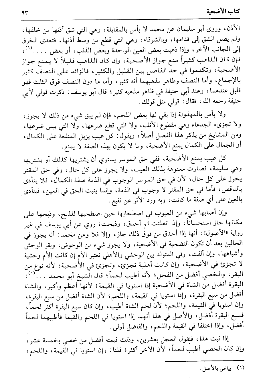 الأذن، وروى أبو سليمان عن محمد لا بأس بالمقابلة، وهي التي شق أذنها من خلفها، ولم يصل الشق إلى قدامها، وبالشرقاء، وهي التي قطع من وسط أذنها، فتعدى الخرق إلى الجانب الآخر، وإذا ذهبت بعض العين الواحدة وبعض الذنب، أو بعض....، فإن كان الذاهب كثيراً منع جواز الأضحية، وإن كان الذاهب قليلاً لا يمنع جواز الأضحية، وتكلموا في حد الفاصل بين القليل والكثير، فالزائد على النصف كثير بالإجماع، وأما النصف وظاهر مذهبهما أنه كثير، وأما ما دون النصف فوق الثلث فهو قليل عندهما، وعند أبي حنيفة في ظاهر مذهبه كثير؛ قال أبو يوسف: ذكرت قولي لأبي حنيفة رحمه الله، فقال: قولي مثل قولك.