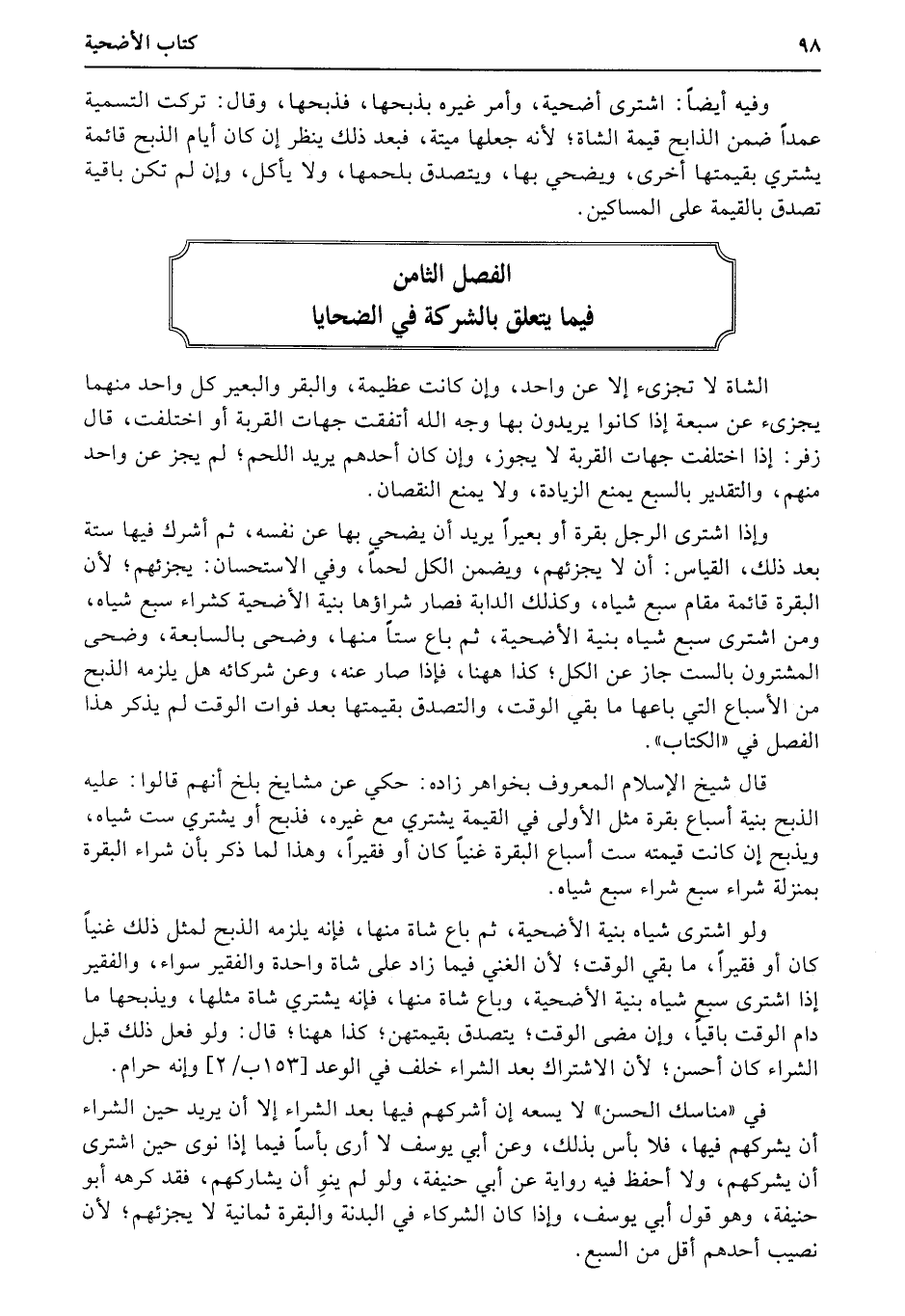 الشاة لا تجزىء إلا عن واحد، وإن كانت عظيمة، والبقر والبعير كل واحد منهما يجزىء عن سبعة إذا كانوا يريدون بها وجه الله أتفقت جهات القربة (أو) اختلفت، قال زفر: إذا اختلفت جهات القربة لا يجوز، وإن كان أحدهم يريد اللحم؛ لم يجز عن واحد منهم، والتقدير بالسبع يمنع الزيادة، ولا يمنع النقصان.