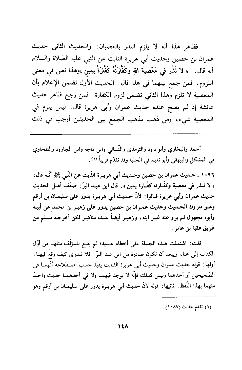 1096 - حديث عمران بن حصين وحديث أبي هريرة الثابت عن النبي - صلى الله عليه وسلم - أنّه قال: "لا نذر في معصية وكفارته كفارة يمين". قال ابن عبد البرّ: ضعّف أهل الحديث حديث عمران وأبي هريرة قالوا: لأنّ حديث أبي هريرة يدور على سليمان بن أرقم وهو متروك الحديث وحديث عمران بن حصين يدور على زهير بن محمد عن أبيه وأبوه مجهول لم يرو عنه غير ابنه، وزهير أيضًا عنده مناكير لكن أخرجه مسلم من طريق عقبة بن عامر.