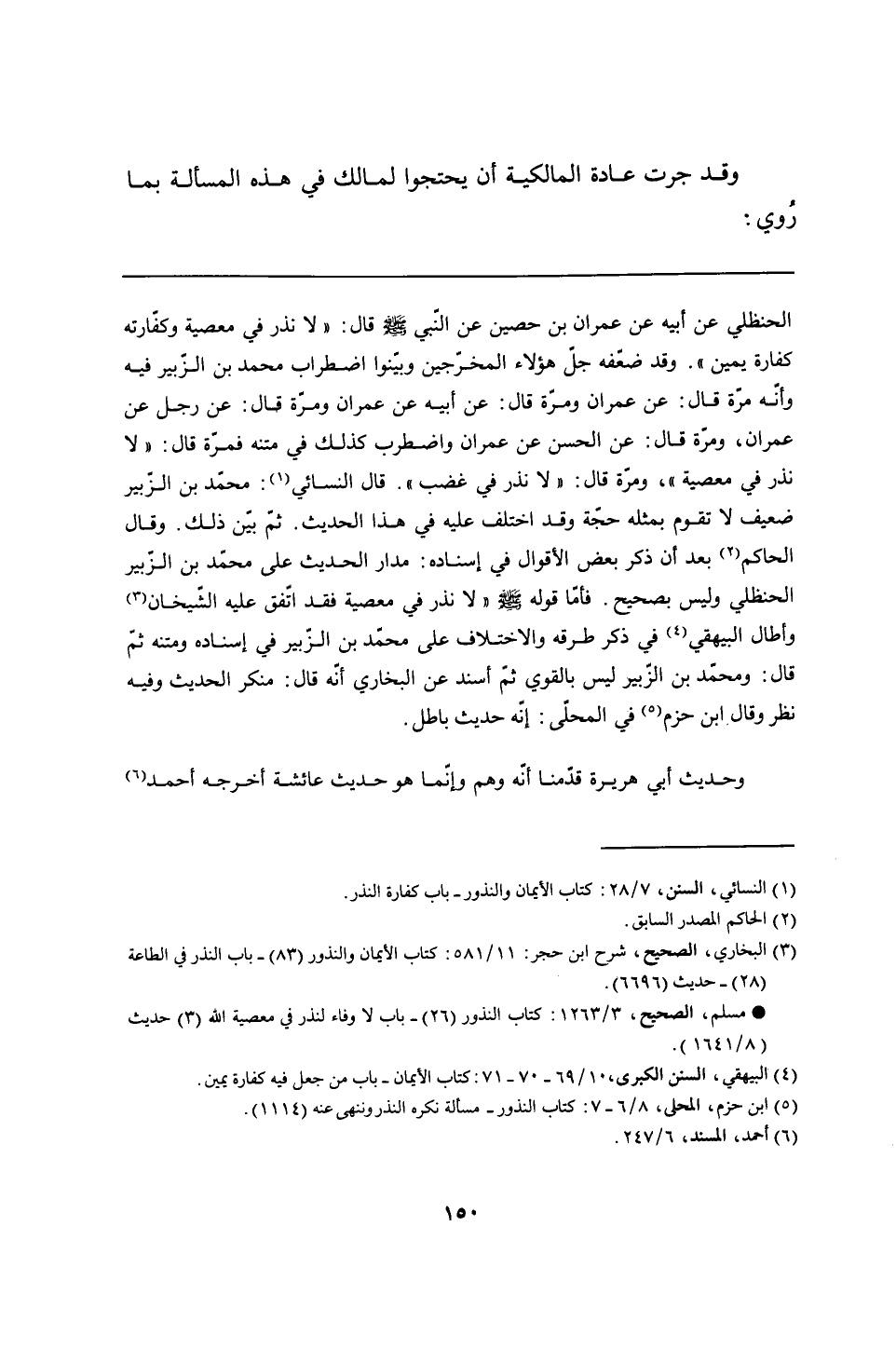 الحنظلي عن أبيه عن عمران بن حصين عن النبي - صلى الله عليه وسلم - قال: "لا نذر في معصية وكفّارته كفارة يمين". وقد ضعّفه جل هؤلاء المخرّجين وبيّنوا اضطراب محمد بن الزّبير فيه وأنه مرّة قال: عن عمران ومرة قال: عن أبيه عن عمران ومرة قال: عن رجل عن عمران، ومرّة قال: عن الحسن عن عمران واضطرب كذلك في متنه فمرة قال: "لا نذر في معصية"، ومرّة قال: "لا نذر في غضب". قال النسائي: محمَّد بن الزبير ضعيف لا تقوم بمثله حجّة وقد اختلف عليه في هذا الحديث. ثمّ بيّن ذلك. وقال الحاكم بعد أن ذكر بعض الأقوال في إسناده: مدار الحديث على محمّد بن الزّبير الحنظلي وليس بصحيح. فأمَّا قوله - صلى الله عليه وسلم - "لا نذر في معصية فقد اتفق عليه الشيخان وأطال البيهقي في ذكر طرقه والاختلاف على محمَّد بن الزبير في إسناده ومتنه ثمّ قال: ومحمَّد بن الزّبير ليس بالقوي ثمّ أسند عن البخاري أنه قال: منكر الحديث وفيه نظر وقال ابن حزم في المحلّى: إنّه حديث باطل.