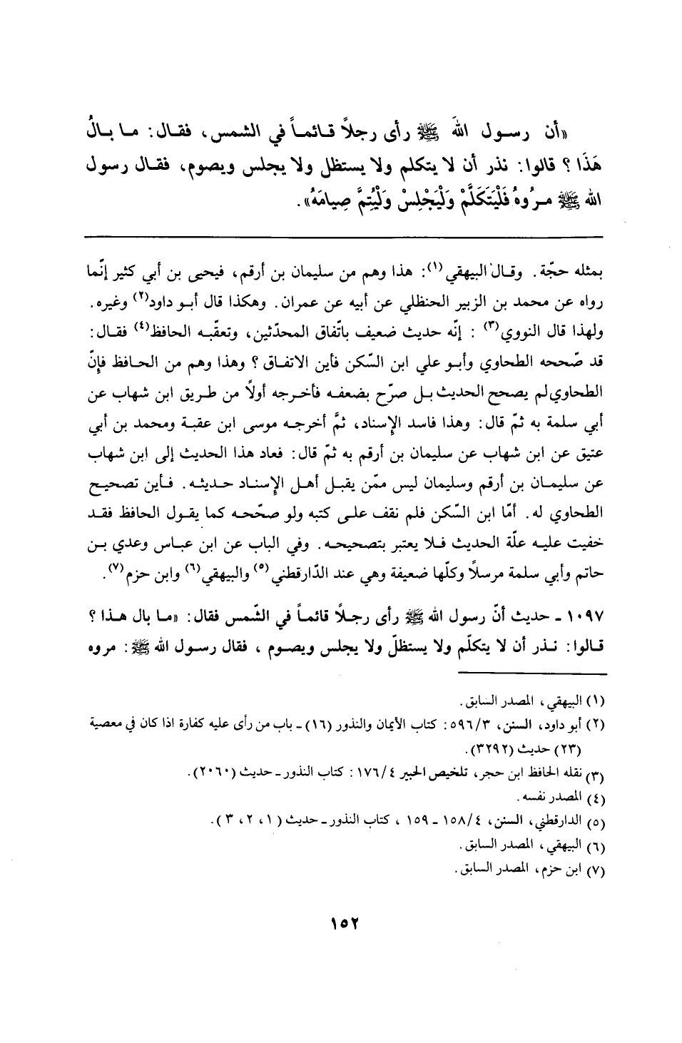 1097 - حديث أن رسول الله - صلى الله عليه وسلم - رأى رجلًا قائمًا في الشمس فقال: "ما بال هذا؟ قالوا: نذر أن لا يتكلّم ولا يستظلّ ولا يجلس ويصوم، فقال رسول الله - صلى الله عليه وسلم -: مروه