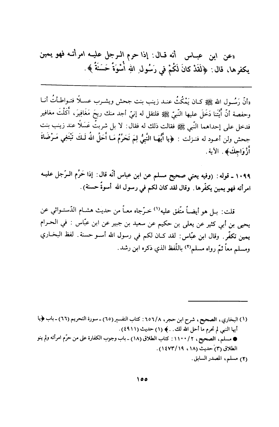 1099 - قوله: (وفيه يعني صحيح مسلم عن ابن عباس أنّه قال: إذا حَرَّم الرَجل عليه امرأته فهو يمين يكفّرها. وقال لقد كان لكم في رسول الله أسوةٌ حسنة).