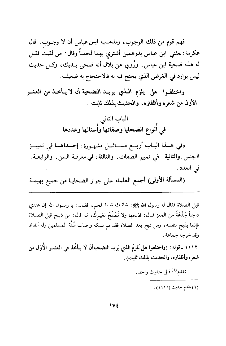 1112 - قوله: (واختلفوا هل يُلزمُ الذي يُريد التضحية أن لَا يأخُذ في العشر الأُوَل من شعره وأظفاره، والحديث بذلك ثابت).
