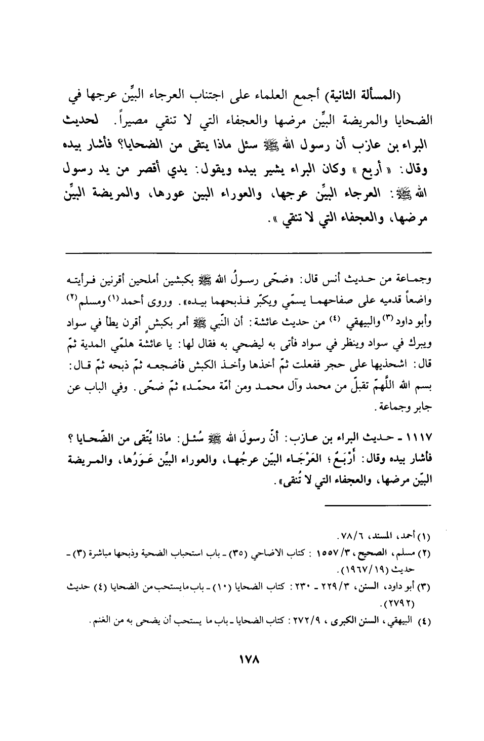 1117 - حديث البراء بن عازب: أنّ رسولَ الله - صلى الله عليه وسلم - سُئل: ماذا يُتقى من الضّحايا؟ فأشار بيده وقال: أرْبَعٌ؛ العَرْجَاء البين عرجُها، والعوراء البين عَوَرُها، والمريضة البيّن مرضها، والعجفاء التي لا تُنقى".