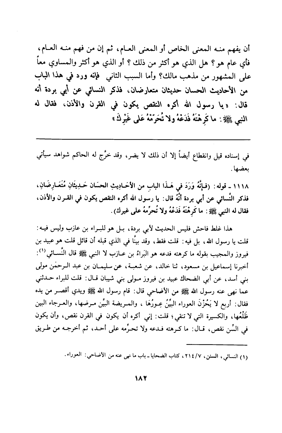 1118 - قوله: (فإِنَّهُ وَرَدَ في هَذَا البابِ من الأحَادِيثِ الحسَان حَدِيثَانِ فتَعَارِضَانِ، فذكر النسائي عن أبي بردة أنَّهُ قال: يا رسول الله أكره النقص يكون في القرن والأذن، فقال له النبي - صلى الله عليه وسلم -: ما كَرِهْتَهُ فَدَعْهُ ولا تُحرِّمهُ على غيرك).
