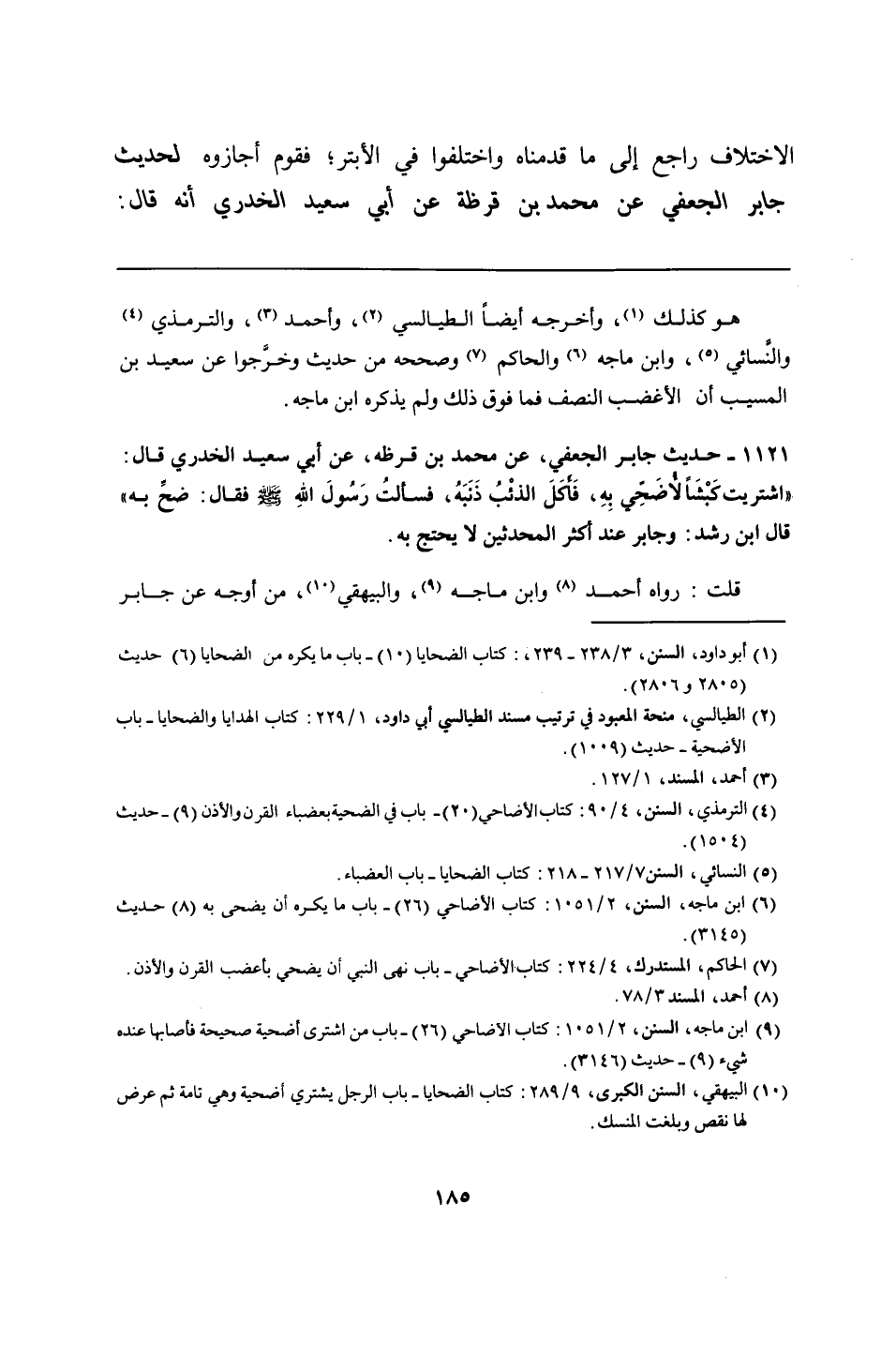 1121 - حديث جابر الجعفي، عن محمد بن قرظه، عن أبي سعيد الخدري قال: "اشتريت كَبْشًا لأضَحّي بِهِ، فَأَكَلَ الذئْبُ ذَنَبَهُ، فسألتُ رَسُولَ اللهِ - صلى الله عليه وسلم - فقال: ضحِّ به" قال ابن رشد: وجابر عند أكثر المحدثين لا يحتج به.