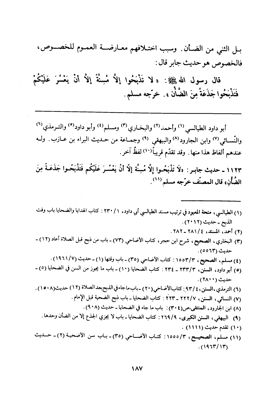 1123 - حديث جابر: "لَا تَذْبَحُوا إلَّا مُسِنَّة إلّا أَنَّ يَعْسُرَ عَلَيْكُم فَتَذْبَحُوا جَذَعَةً مِنَ الضَّأنِ" قال المصنّف خرّجه مسلم.