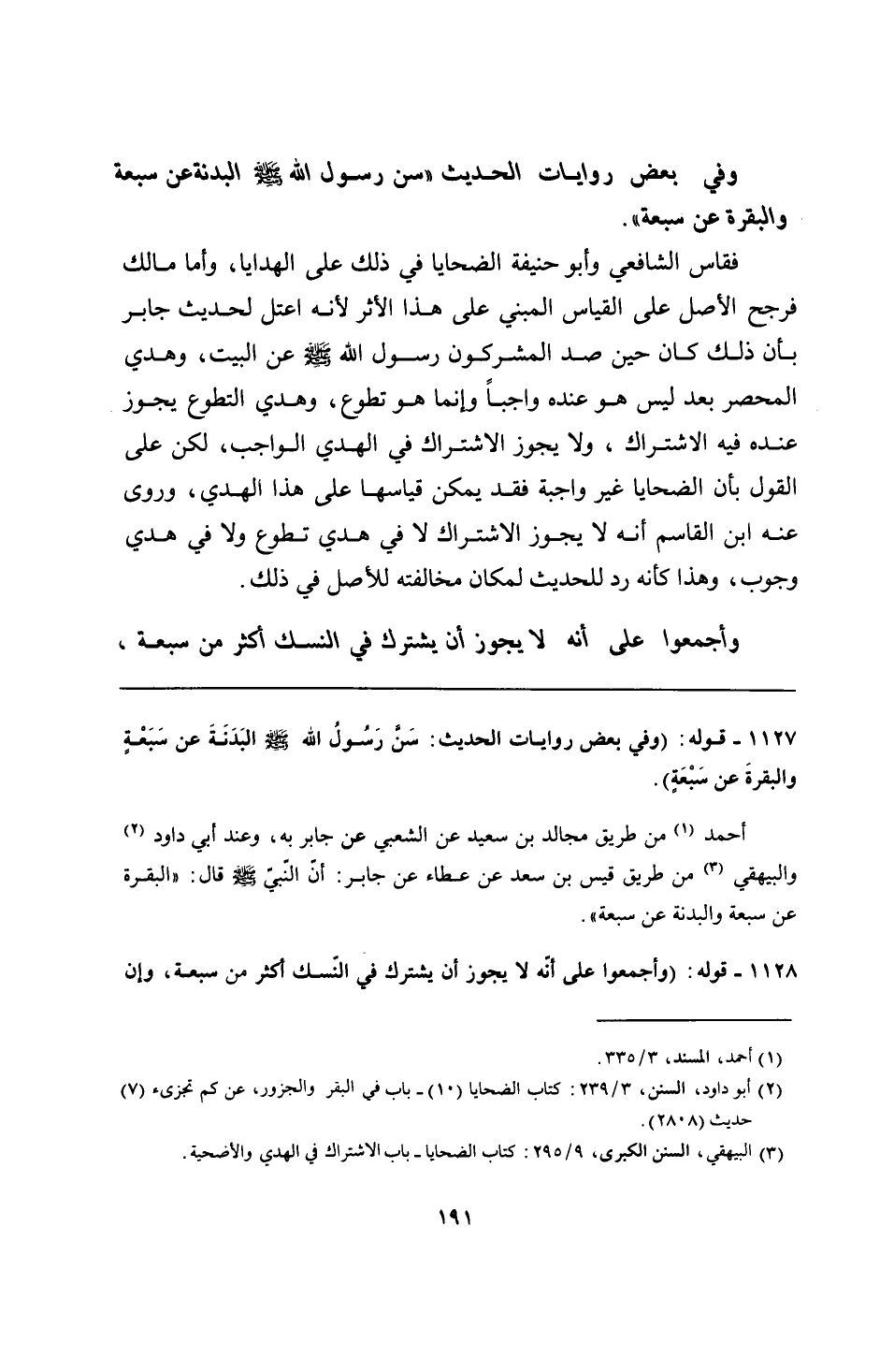 1128 - قوله: (وأجمعوا على أنّه لا يجوز أن يشترك في النّسك أكثر من سبعة، وإن