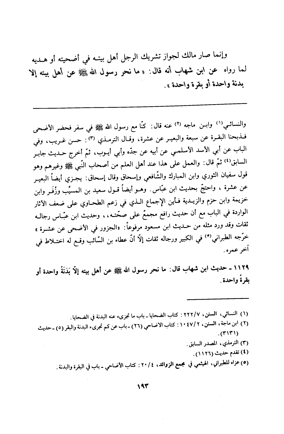 والنسائي وابن ماجه عنه قال: كنّا مع رسول الله - صلى الله عليه وسلم - في سفر فحضر الأضحى فذبحنا البقرة عن سبعة والبعير عن عشرة، وقال الترمذي: حسن غريب، وفي الباب عن أبي الأسد الأسلمي عن أبيه عن جدّه وأبي أيوب، ثمّ أخرج حديث جابر السابق ثمّ قال: والعمل على هذا عند أهل العلم من أصحاب النّبيَّ - صلى الله عليه وسلم - وغيرهم وهو قول سفيان الثوري وابن المبارك والشافعي وإسحاق وقال إسحاق: يجزي أيضًا البعير عن عشرة، واحتجّ بحديث ابن عبّاس. وهو أيضًا قول سعيد بن المسيِّب وزُفَر وابن خزيمة وابن حزم والزيدية فأين الإجماع الذي في زعم الطحاوي على ضعف الآثار الواردة في الباب مع أن حديث رافع مجمعٌ على صحّته،، وحديث ابن عبّاس رجاله ثقات وقد ورد مثله من حديث ابن مسعود مرفوعًا: "الجزور في الأضحى عن عشرة" خرّجه الطبراني في الكبير ورجاله ثقات إلَّا أَنَّ عطاء بن السّائب وقع له اختلاط في آخر عمره.