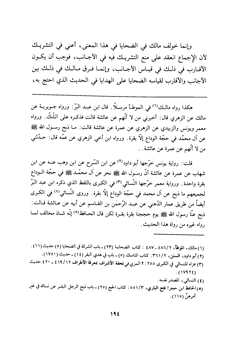 قلت: رواية يونس خرّجها أبو داود عن ابن السّرح عن ابن وهب عنه عن ابن شهاب عن عمرة عن عائشة أن رسول الله - صلى الله عليه وسلم - نحر عن آل محمَّد - صلى الله عليه وسلم - في حجّة الوداع بقرة واحدة. ورواية معمر خرّجها النسائي في الكبرى باللفظ الذي ذكره ابن عبد البَرّ لجميعهم ما ذبح عن آل محمد في حجّة الوداع إلّا بقرة. وروى النسائي في الكبرى أيضًا من طريق عمار الدّهني عن عبد الرحمن بن القاسم عن أبيه عن عائشة قالت: ذبح عنّا رسول الله - صلى الله عليه وسلم - يوم حججنا بقرة بقرة لكن قال الحافظ إنه شاذ مخالف لما رواه غيره من رواة هذا الحديث.