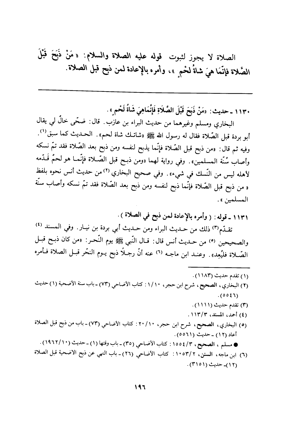1130 - حديث: "مَنْ ذَبَحَ قَبْلَ الصَّلَاةِ فَإِنَّمَا هِيَ شَاةُ لَحْمٍ".