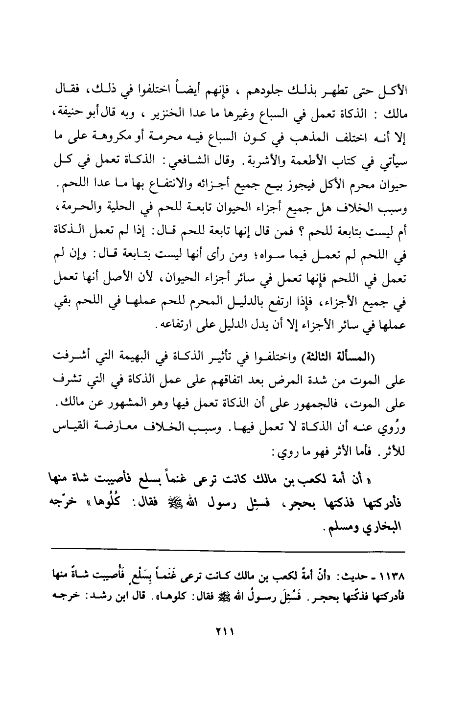 1138 - حديث: "أنّ أمةً لكعب بن مالك كانت ترعى غَنَمًا بِسَلْع فَأصيبت شاةٌ منها فأدركتها فذكّتها بحجر. فَسُئِلَ رسولُ الله - صلى الله عليه وسلم - فقال: كلوها". قال ابن رشد: خرجه