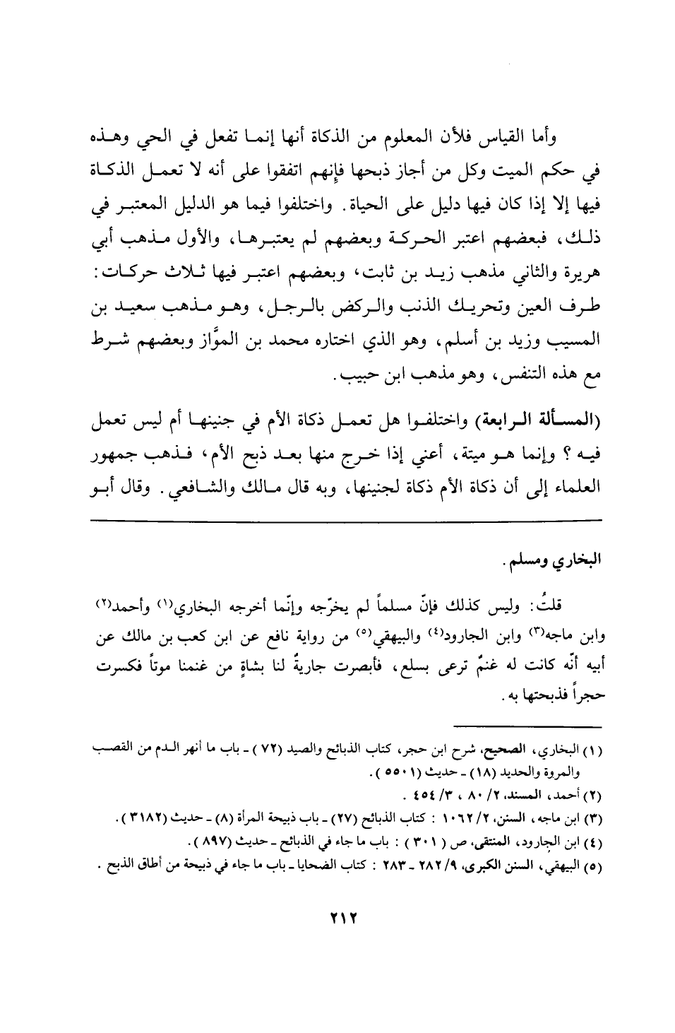 قلتُ: وليس كذلك فإن مسلمًا لم يخرجه وإنّما أخرجه البخاري وأحمد وابن ماجه وابن الجارود والبيهقي من رواية نافع عن ابن كعب بن مالك عن أبيه أنه كانت له غنمٌ ترعى بسلع، فأبصرت جاريةٌ لنا بشاةٍ من غنمنا موتًا فكسرت حجرًا فذبحتها به.