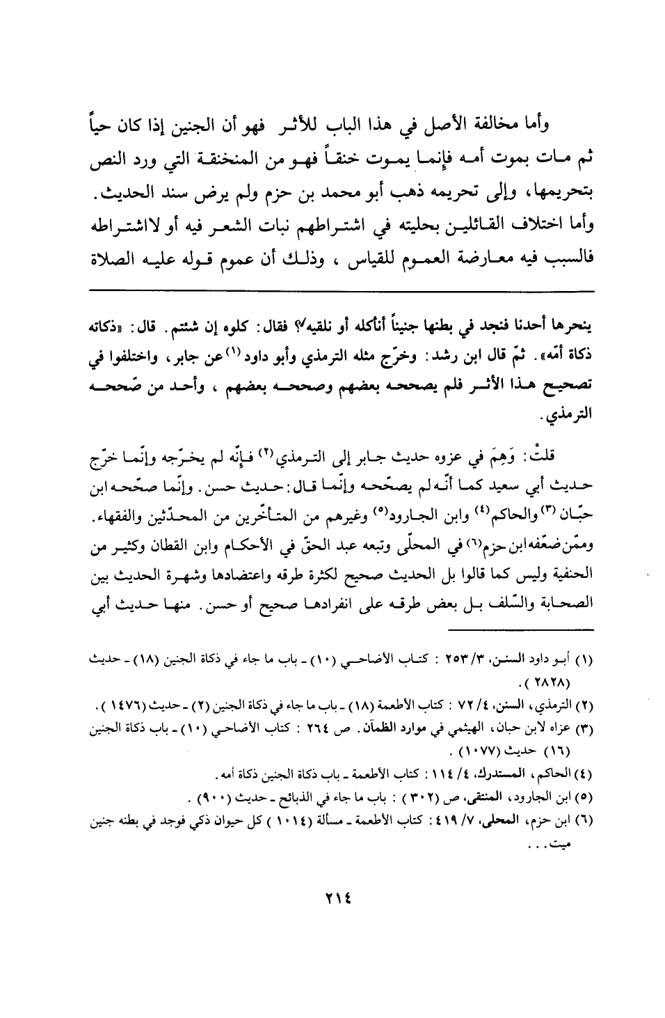 ينحرها أحدنا فنجد في بطنها جنينًا أنأكله أو نلقيه؟ فقال: كلوه إن شئتم. قال: "ذكاته ذكاة أمّه". ثمّ قال ابن رشد: وخرّج مثله الترمذي وأبو داود عن جابر، واختلفوا في تصحيح هذا الأثر فلم يصححه بعضهم وصححه بعضهم، وأحد من صّححه الترمذي.