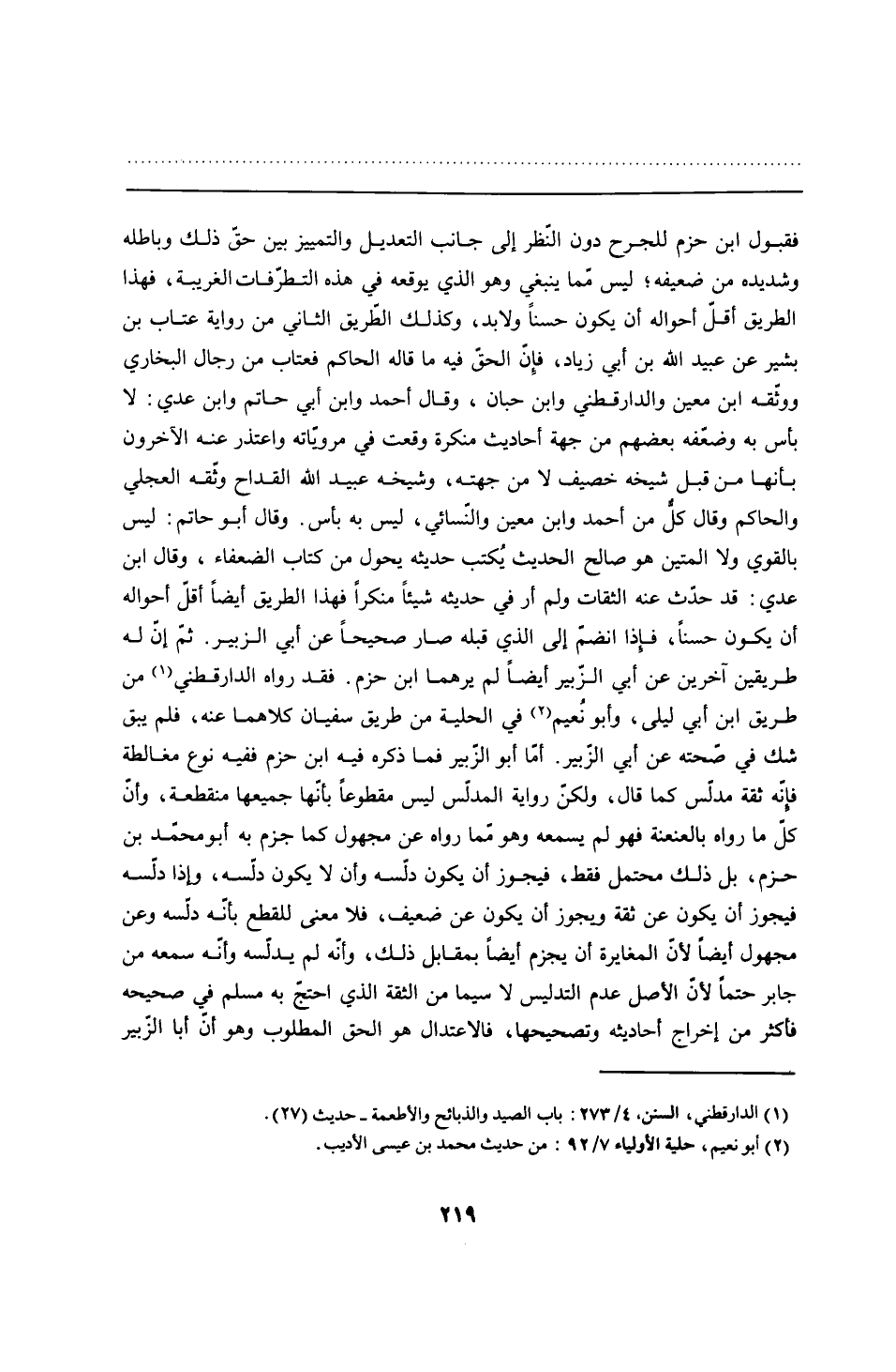 فقبول ابن حزم للجرح دون النظر إلى جانب التعديل والتمييز بين حقّ ذلك وباطله وشديده من ضعيفه؛ ليس مما ينبغي وهو الذي يوقعه في هذه التطرّفات الغريبة، فهذا الطريق أقلّ أحواله أن يكون حسنًا ولابد، وكذلك الطريق الثاني من رواية عتاب بن بشير عن عبيد الله بن أبي زياد، فإِن الحقّ فيه ما قاله الحاكم فعتاب من رجال البخاري ووثّقه ابن معين والدارقطني وابن حبّان، وقال أحمد وابن أبي حاتم وابن عدي: لا بأس به وضعّفه بعضهم من جهة أحاديث منكرة وقعت في مرويّاته واعتذر عنه الآخرون بأنها من قبل شيخه خصيف لا من جهته، وشيخه عبيد الله القداح وثّقه العجلي والحاكم وقال كل من أحمد وابن معين والنسائي، ليس به بأس. وقال أبو حاتم: ليس بالقوي ولا المتين هو صالح الحديث يُكتب حديثه يحول من كتاب الضعفاء، وقال ابن عدي: قد حدّث عنه الثقات ولم أر في حديثه شيئًا منكرًا فهذا الطريق أيضًا أقل أحواله أن يكون حسنًا، فإذا انضمّ إلى الذي قبله صار صحيحًا عن أبي الزبير. ثمّ إن له طريقين آخرين عن أبي الزّبير أيضًا لم يرهما ابن حزم. فقد رواه الدارقطني من طريق ابن أبي ليلى، وأبو نُعيم في الحلية من طريق سفيان كلاهما عنه، فلم يبق شك في صحته عن أبي الزّبير. أمّا أبو الزّبير فما ذكره فيه ابن حزم ففيه نوع مغالطة فإنّه ثقة مدلّس كما قال، ولكنّ رواية المدلّس ليس مقطوعًا بأنها جميعها منقطعة، وأنّ كلّ ما رواه بالعنعنة فهو لم يسمعه وهو مّما رواه عن مجهول كما جزم به أبو محمّد بن حزم، بل ذلك محتمل فقط، فيجوز أن يكون دلّسه وأن لا يكون دلّسه، واذا دلّسه فيجوز أن يكون عن ثقة ويجوز أن يكون عن ضعيف، فلا معنى للقطع بأنّه دلّسه وعن مجهول أيضًا لأنَّ المغايرة أن يجزم أيضًا بمقابل ذلك، وأنه لم يدلّسه وأنّه سمعه من جابر حتمًا لأن الأصل عدم التدليس لاسيما من الثقة الذي احتجّ به مسلم في صحيحه فأكثر من إخراج أحاديثه وتصحيحها، فالاعتدال هو الحق المطلوب وهو أَنَّ أبا الزّبير