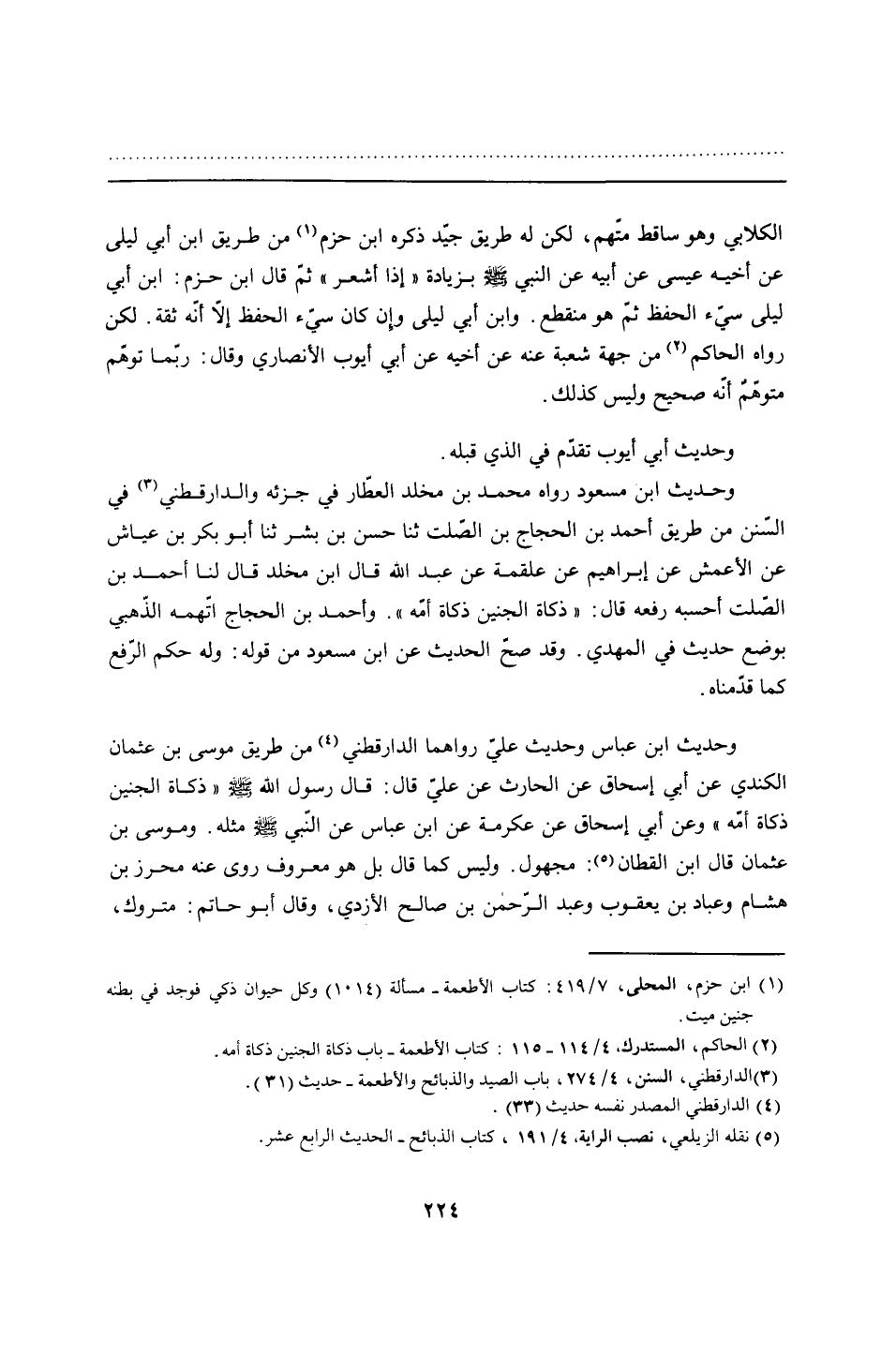 وحديث ابن مسعود رواه محمد بن مخلد العطّار في جزئه والدارقطني في السنن من طريق أحمد بن الحجاج بن الصّلت ثنا حسن بن بشر ثنا أبو بكر بن عياش عن الأعمش عن إبراهيم عن علقمة عن عبد الله قال ابن مخلد قال لنا أحمد بن الصّلت أحسبه رفعه قال: "ذكاة الجنين ذكاة أمّه". وأحمد بن الحجاج اتّهمه الذّهبي بوضع حديث في المهدي. وقد صحّ الحديث عن ابن مسعود من قوله: وله حكم الرّفع كما قدّمناه.