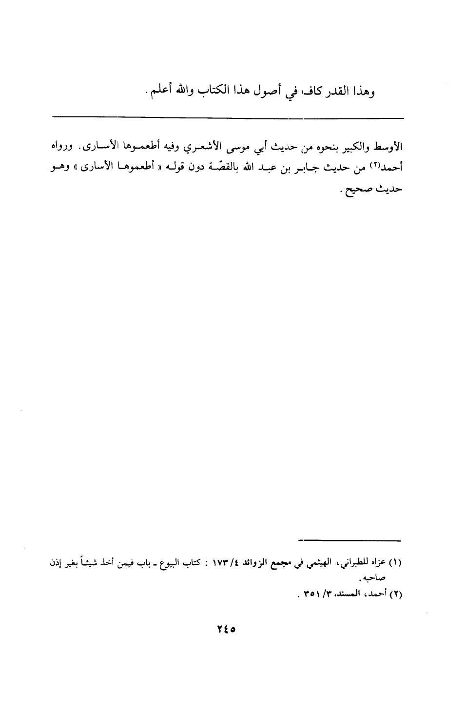 الأوسط والكبير بنحوه من حديث أبي موسى الأشعري وفيه أطعموها الأسارى. ورواه أحمد من حديث جابر بن عبد الله بالقصّة دون قوله "أطعموها الأسارى" وهو حديث صحيح.