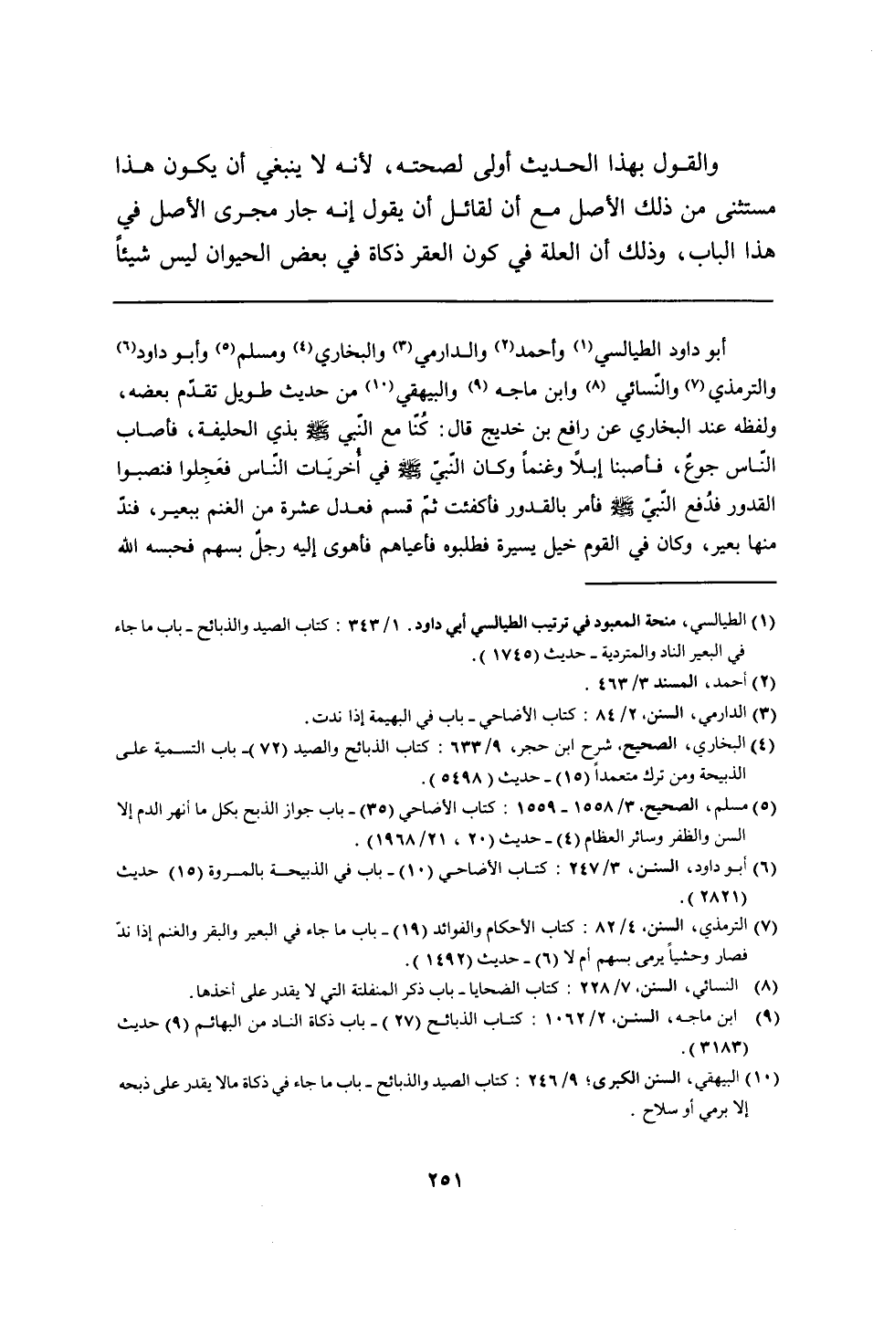 أبو داود الطيالسي وأحمد والدارمي والبخاري ومسلم وأبو داود والترمذي والنسائي وابن ماجه والبيهقي من حديث طويل تقدّم بعضه، ولفظه عند البخاري عن رافع بن خديج قال: كُنّا مع النّبيَّ - صلى الله عليه وسلم - بذي الحليفة، فأصاب النَّاس جوعٌ، فأصبنا إبلًا وغنمًا وكان النَّبيَّ - صلى الله عليه وسلم - في أُخريَات النَّاس فعَجِلوا فنصبوا القدور فدُفع النَّبيَّ - صلى الله عليه وسلم - فأمر بالقدور فأكفئت ثمّ قسم فعدل عشرة من الغنم ببعير، فندّ منها بعير، وكان في القوم خيل يسيرة فطلبوه فأعياهم فأهوى إليه رجلٌ بسهم فحبسه الله