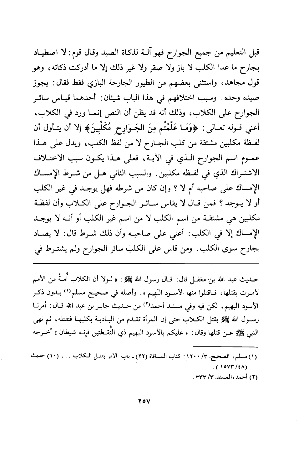 حديث عبد الله بن مغفل قال: قال رسول الله - صلى الله عليه وسلم -: "لولا أن الكلاب أُمةٌ من الأمم لأمرت بقتلها، فاقتلوا منها الأسود البَهِيم". وأصله في صحيح مسلم بدون ذكر الأسود البهيم، لكن فيه وفي مسند أحمد من حديث جابر بن عبد الله قال: أمرنا رسول الله - صلى الله عليه وسلم - بقتل الكلاب حتى إن المرأة تقدم من البادية بكلبها فتقتله، ثم نهى النبي - صلى الله عليه وسلم - عن قتلها وقال: "عليكم بالأسود البهيم ذي النُّقطتين فإِنه شيطان" أخرجه