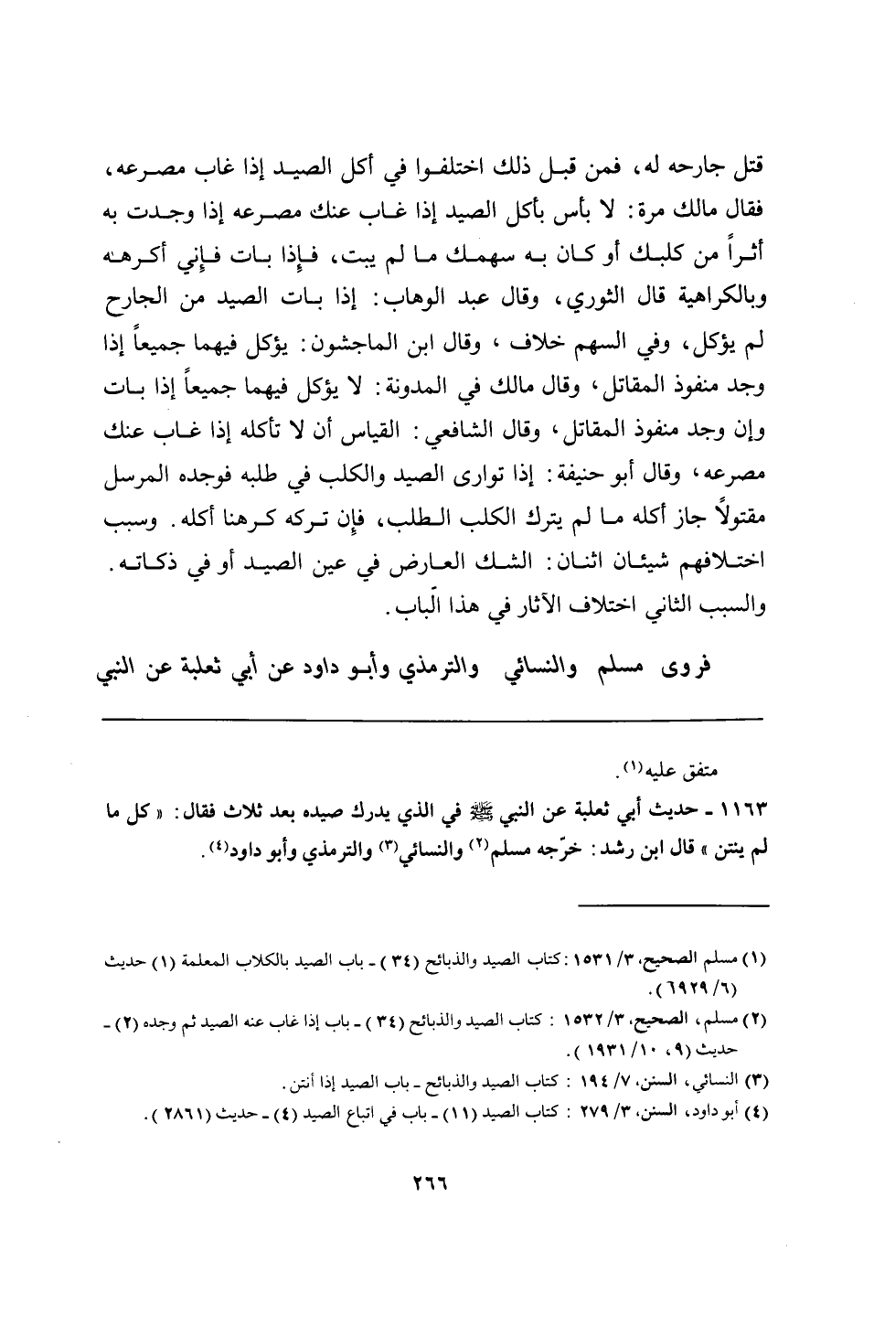 1163 - حديث أبي ثعلبة عن النبي - صلى الله عليه وسلم - في الذي يدرك صيده بعد ثلاث فقال: "كل ما لم ينتن" قال ابن رشد: خرّجه مسلم والنسائي والترمذي وأبو داود.