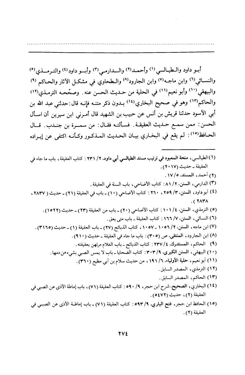 أبو داود والطيالسي وأحمد والدارمي وأبو داود والترمذي والنسائي وابن ماجه وابن الجارود والطحاوي في مشكل الآثار والحاكم والبيهقي وأبو نعيم في الحلية من حديث الحسن عنه. وصحّحه الترمذي والحاكم وهو في صحيح البخاري بدون ذكر متنه فإنه قال: حدثني عبد الله بن أبي الأسود حدثنا قريش بن أنس عن حبيب بن الشهيد قال أمرني ابن سيرين أن أسأل الحسن: ممن سمع حديث العقيقة. فسألته فقال: من سمرة بن جندب. قال الحافظ: لم يقع في البخاري بيان الحديث المذكور وكأنه اكتفى عن إيراده