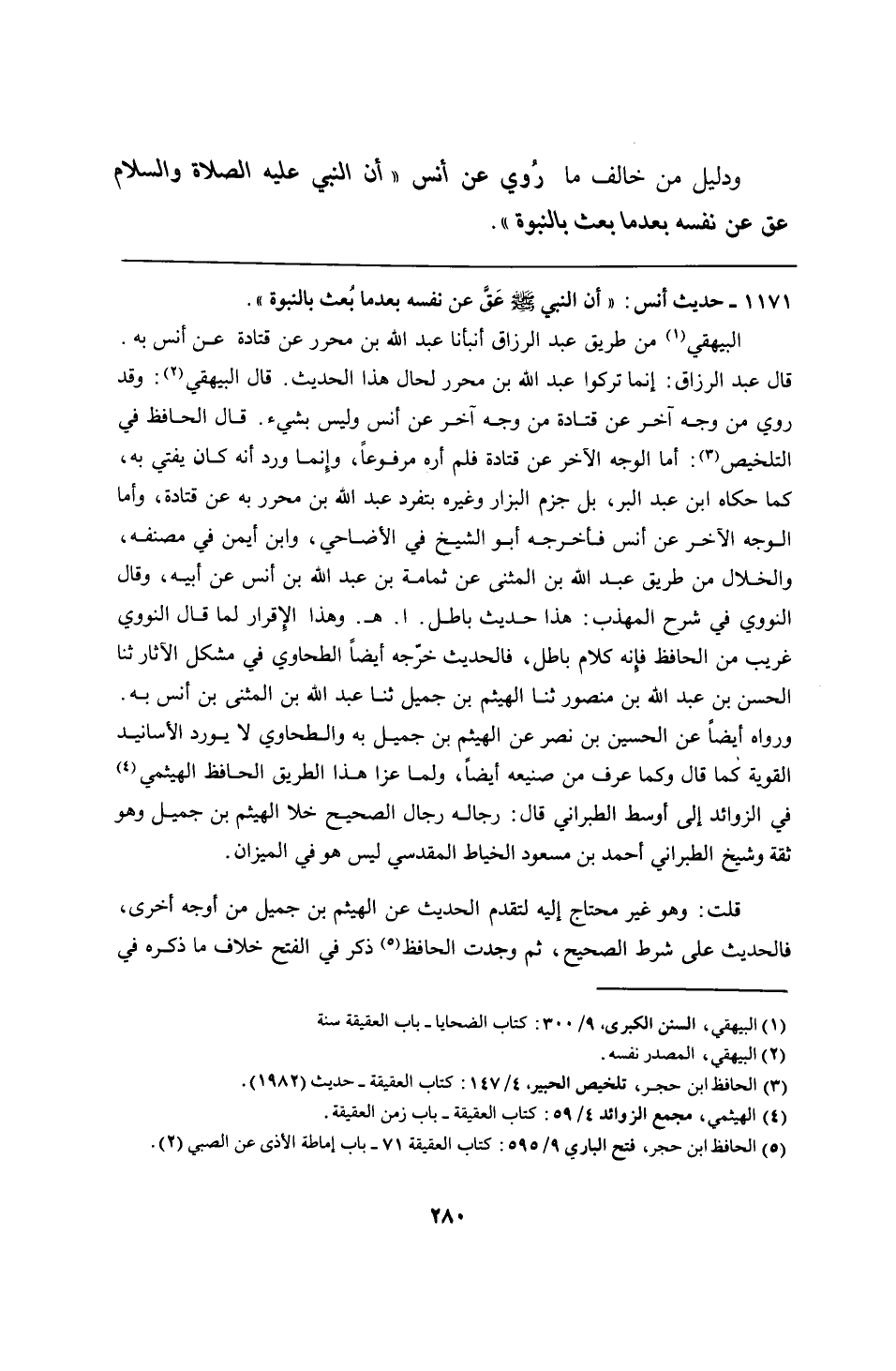 البيهقي من طريق عبد الرزاق أنبأنا عبد الله بن محرر عن قتادة عن أنس به. قال عبد الرزاق: إنما تركوا عبد الله بن محرر لحال هذا الحديث. قال البيهقي: وقد روي من وجه آخر عن قتادة من وجه آخر عن أنس وليس بشيء. قال الحافظ في التلخيص: أما الوجه الآخر عن قتادة فلم أره مرفوعًا، وإِنما ورد أنه كان يفتي به، كما حكاه ابن عبد البر، بل جزم البزار وغيره بتفرد عبد الله بن محرر به عن قتادة، وأما الوجه الآخر عن أنس فأخرجه أبو الشيخ في الأضاحي، وابن أيمن في مصنفه، والخلال من طريق عبد الله بن المثنى عن ثمامة بن عبد الله بن أنس عن أبيه، وقال النووي في شرح المهذب: هذا حديث باطل. ا. هـ. وهذا الإِقرار لما قال النووي غريب من الحافظ فإنه كلام باطل، فالحديث خرّجه أيضًا الطحاوي في مشكل الآثار ثنا الحسن بن عبد الله بن منصور ثنا الهيثم بن جميل ثنا عبد الله بن المثنى بن أنس به. ورواه أيضًا عن الحسين بن نصر عن الهيثم بن جميل به والطحاوي لا يورد الأسانيد القوية كما قال وكما عرف من صنيعه أيضًا، ولما عزا هذا الطريق الحافظ الهيثمي في الزوائد إلى أوسط الطبراني قال: رجاله رجال الصحيح خلا الهيثم بن جميل وهو ثقة وشيخ الطبراني أحمد بن مسعود الخياط المقدسي ليس هو في الميزان.