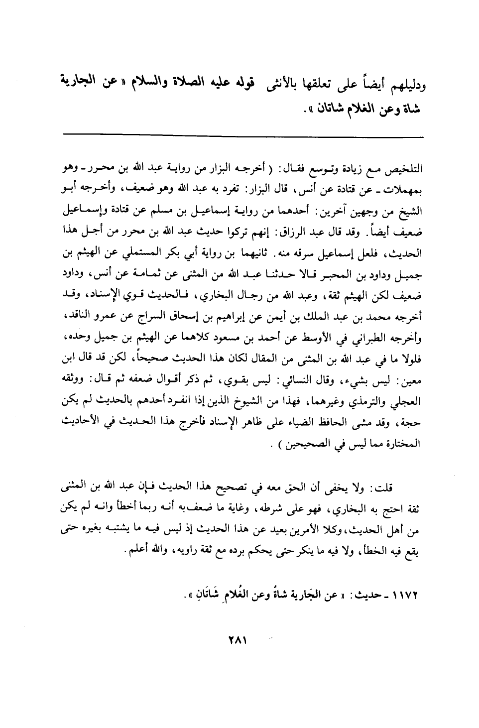 1172 - حديث: "عن الجَارية شاة وعن الغُلامِ شَاتَانِ".