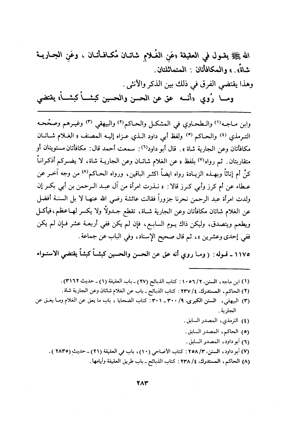 1175 - قوله: (وما روي أنه عق عن الحسن والحسين كبشًا كبشًا يقتضي الاستواء