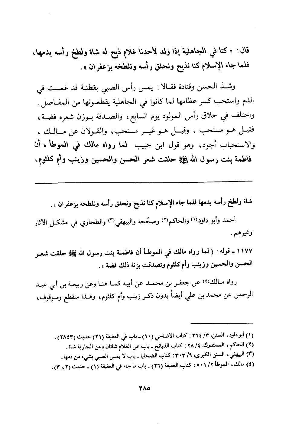 1177 - قوله: "لما رواه مالك في الموطأ أن فاطمة بنت رسول الله - صلى الله عليه وسلم - حلقت شعر الحسن والحسين وزينب وأم كلثوم وتصدقت بزنة ذلك فضة".
