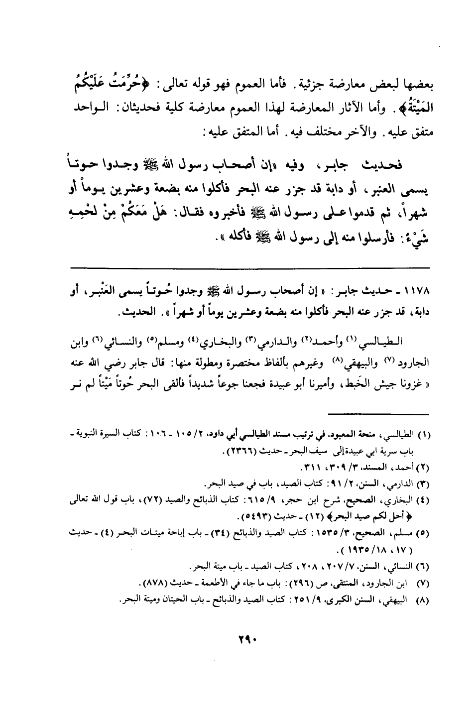 1178 - حديث جابر: "إن أصحاب رسول الله - صلى الله عليه وسلم - وجدوا حُوتًا يسمى العَنْبر، أو دابة، قد جزر عنه البحر فأكلوا منه بضعة وعشرين يومًا أو شهرًا". الحديث.