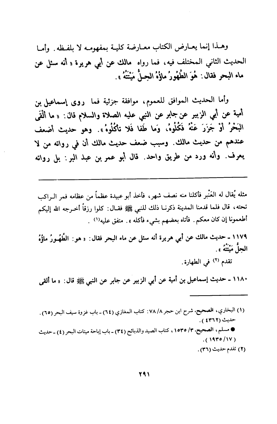 1179 - حديث مالك عن أبي هريرة أنه سئل عن ماء البحر فقال: "هو: الطَّهُورُ ماؤُهُ الحِلُّ مَيْتَتُهُ".