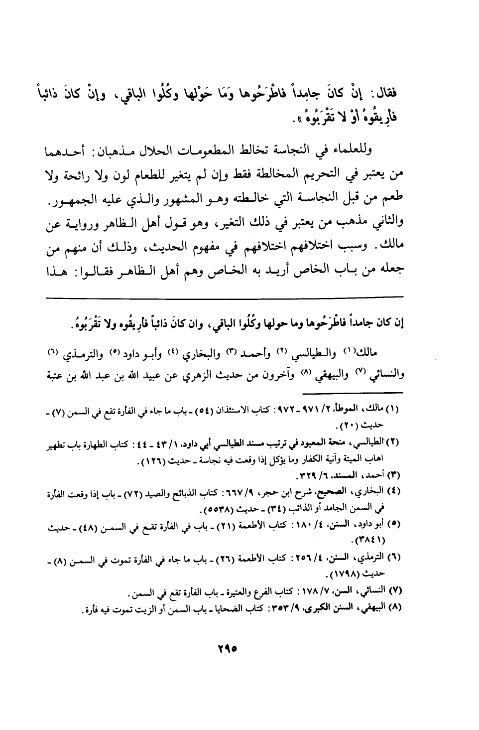 إن كان جامدًا فاطْرَحُوها وما حولها وكُلُوا الباقي، وإن كانَ ذائبًا فأرِيقُوه ولا تَقْرَبُوهُ.