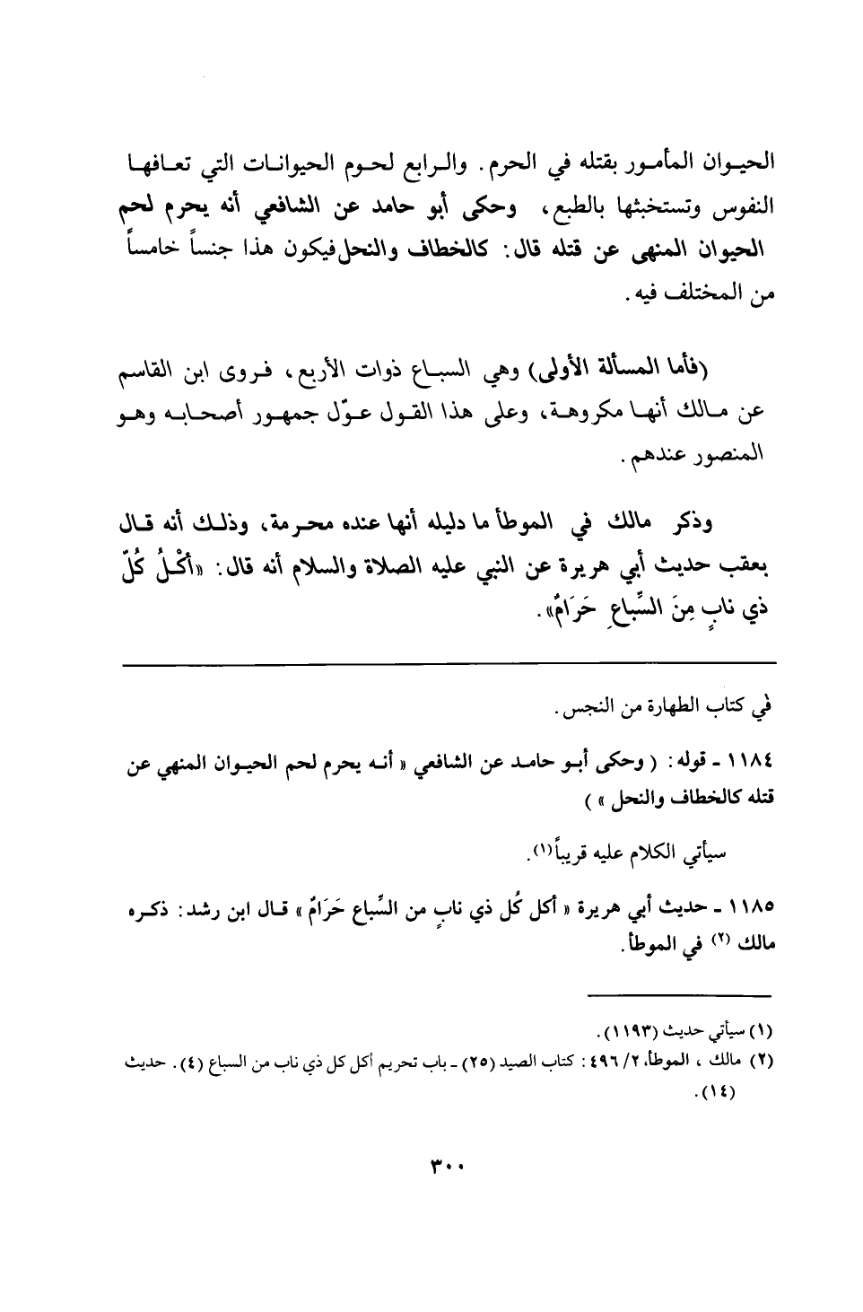 1185 - حديث أبي هريرة "أكل كُل ذي نابٍ من السباع حَرَامٌ" قال ابن رشد: ذكره مالك في الموطأ.