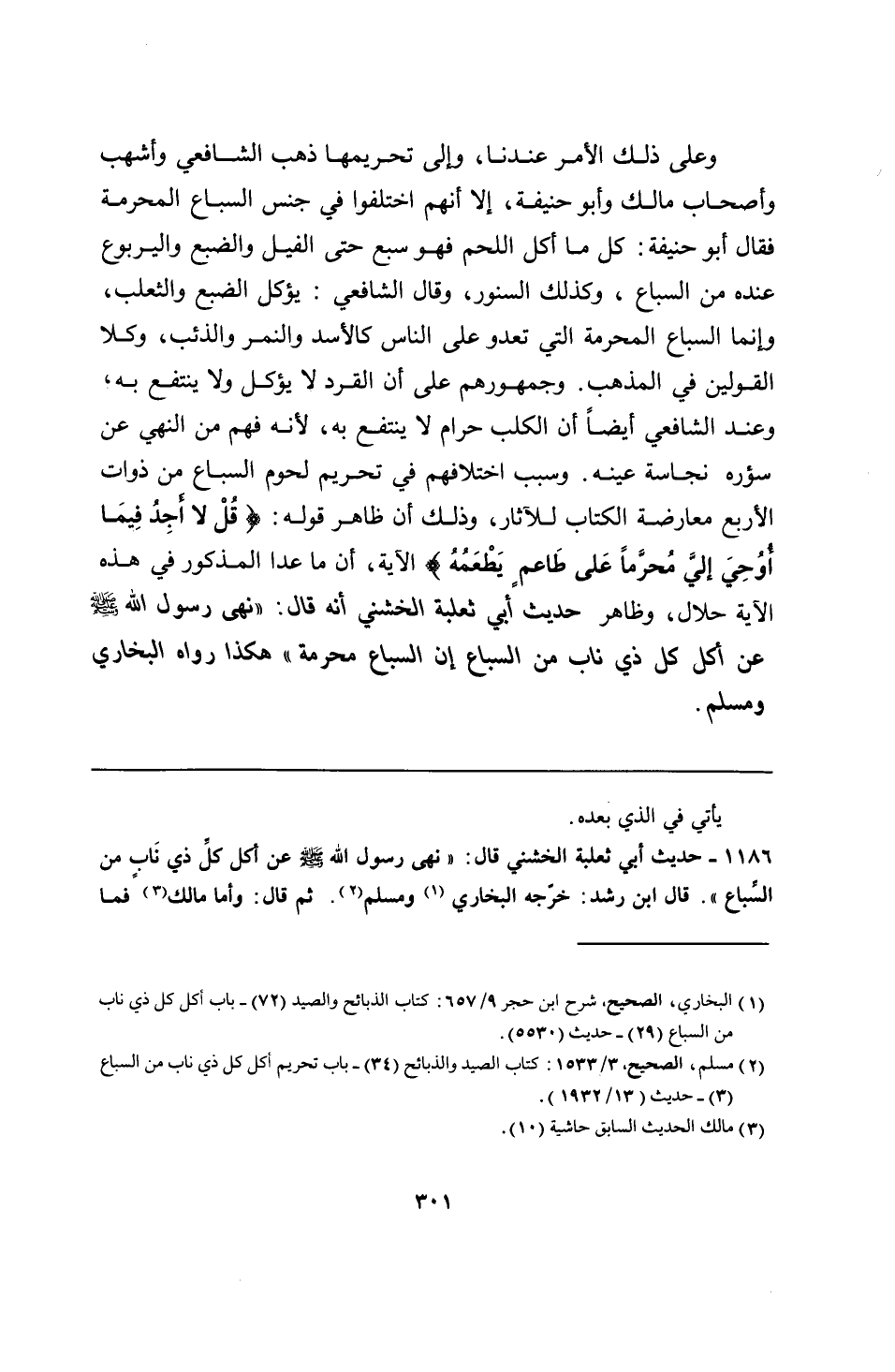 1186 - حديث أبي ثعلبة الخشني قال: "نهى رسول الله - صلى الله عليه وسلم - عن أكل كل ذي نَابٍ من السِّباع". قال ابن رشد: خرّجه البخاري ومسلم. ثم قال: وأما مالك فما
