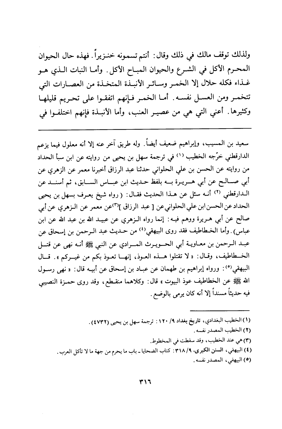 سعيد بن المسيب، وإبراهيم ضعيف أيضًا. وله طريق آخر عنه إلا أنه معلول فيما يزعم الدارقطني خرّجه الخطيب في ترجمة سهل بن يحيى من روايته عن ابن سبأ الحداد من روايته عن الحسن بن علي الحلواني حدثنا عبد الرزاق أخبرنا معمر عن الزهري عن أبي صالح عن أبي هريرة به بلفظ حديث ابن عباس السابق، ثم أسند عن الدارقطني أنه سئل عن هذا الحديث فقال: (رواه شيخ يعرف بسهل بن يحيى الحداد عن الحسن ابن علي الحلواني عن عبد الرزاق عن معمر عن الزهري عن أبي صالح عن أبي هريرة ووهم فيه: إنما رواه الزهري عن عبيد الله بن عبد الله عن ابن عباس). وأما الخطاطيف فقد روى البيهقي من حديث عبد الرحمن بن إسحاق عن عبد الرحمن بن معاوية أبي الحويرث المرادي عن النبي - صلى الله عليه وسلم - أنه نهى عن قتل الخطاطيف، وقال: "لا تقتلوا هذه العوذ، إنها تعوذ بكم من غيركم". قال البيهقي: ورواه إبراهيم بن طهمان عن عباد بن إسحاق عن أبيه قال: "نهى رسول الله - صلى الله عليه وسلم - عن الخطاطيف عوذ البيوت" قال: وكلاهما منقطع، وقد روى حمزة النصيبي فيه حديثًا مسندًا إلا أنه كان يرمى بالوضع.