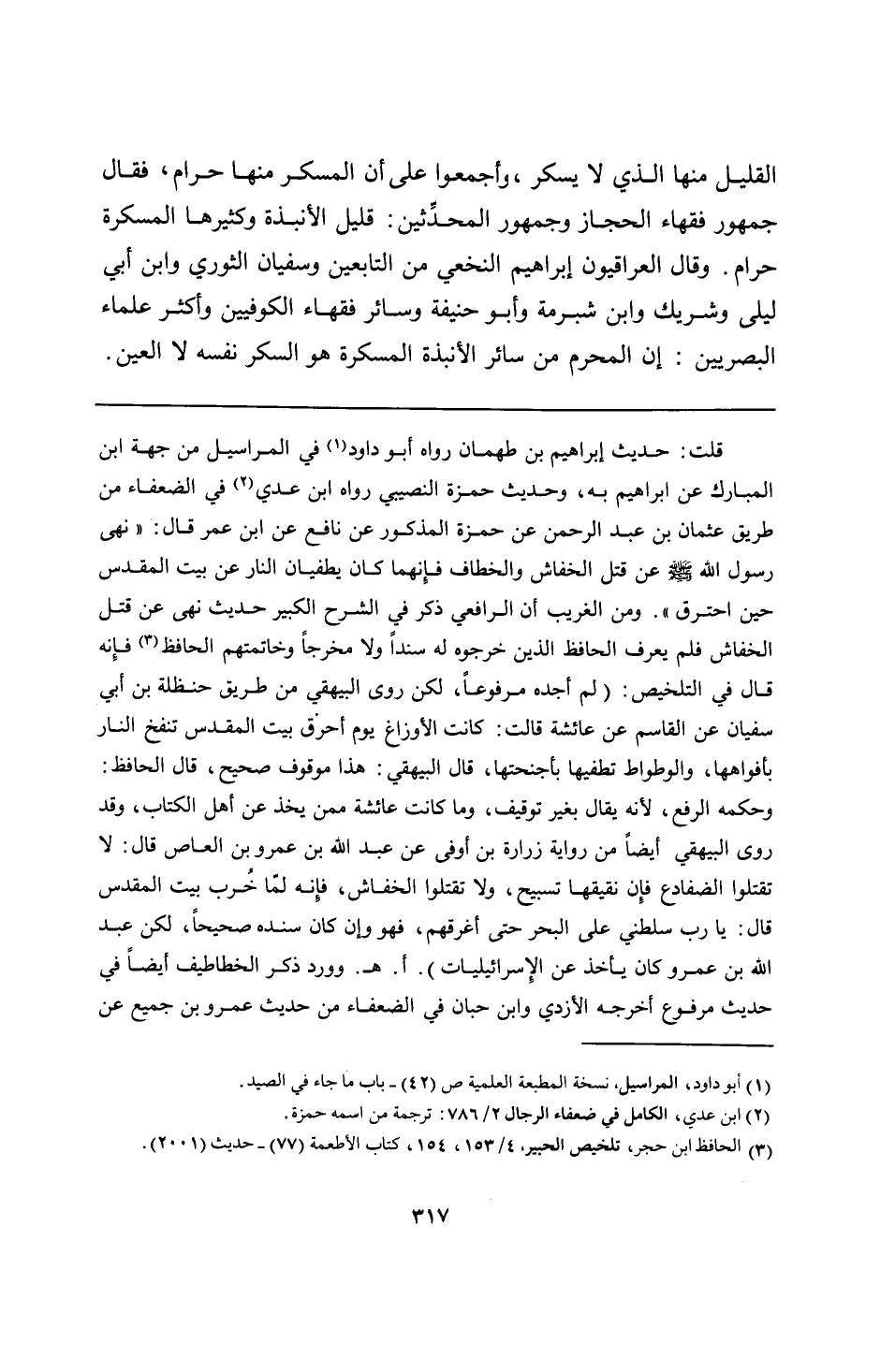 قلت: حديث إبراهيم بن طهمان رواه أبو داود في المراسيل من جهة ابن المبارك عن إبراهيم به، وحديث حمزة النصيبي رواه ابن عدي في الضعفاء من طريق عثمان بن عبد الرحمن عن حمزة المذكور عن نافع عن ابن عمر قال: "نهى رسول الله - صلى الله عليه وسلم - عن قتل الخفاش والخطاف فإِنهما كان يطفيان النار عن بيت المقدس حين احترق". ومن الغريب أن الرافعي ذكر في الشرح الكبير حديث نهى عن قتل الخفاش فلم يعرف الحافظ الذين خرجوه له سندًا ولا مخرجًا وخاتمتهم الحافظ فإِنه قال في التلخيص: (لم أجده مرفوعًا، لكن روى البيهقي من طريق حنظلة بن أبي سفيان عن القاسم عن عائشة قالت: كانت الأوزاغ يوم أحرق بيت المقدس تنفخ النار بأفواهها، والوطواط تطفيها بأجنحتها، قال البيهقي: هذا موقوف صحيح، قال الحافظ: وحكمه الرفع، لأنه يقال بغير توقيف، وما كانت عائشة ممن يأخذ عن أهل الكتاب، وقد روى البيهقي أيضًا من رواية زرارة بن أوفى عن عبد الله بن عمرو بن العاص قال: لا تقتلوا الضفادع فإِن نقيقها تسبيح، ولا تقتلوا الخفاش، فإِنه لمّا خُرب بيت المقدس قال: يا رب سلطني على البحر حتى أغرقهم، فهو وإن كان سنده صحيحًا، لكن عبد الله بن عمرو كان يأخذ عن الإِسرائيليات).أ. هـ. وورد ذكر الخطاطيف أيضًا في حديث مرفوع أخرجه الأزدي وابن حبان في الضعفاء من حديث عمرو بن جميع عن