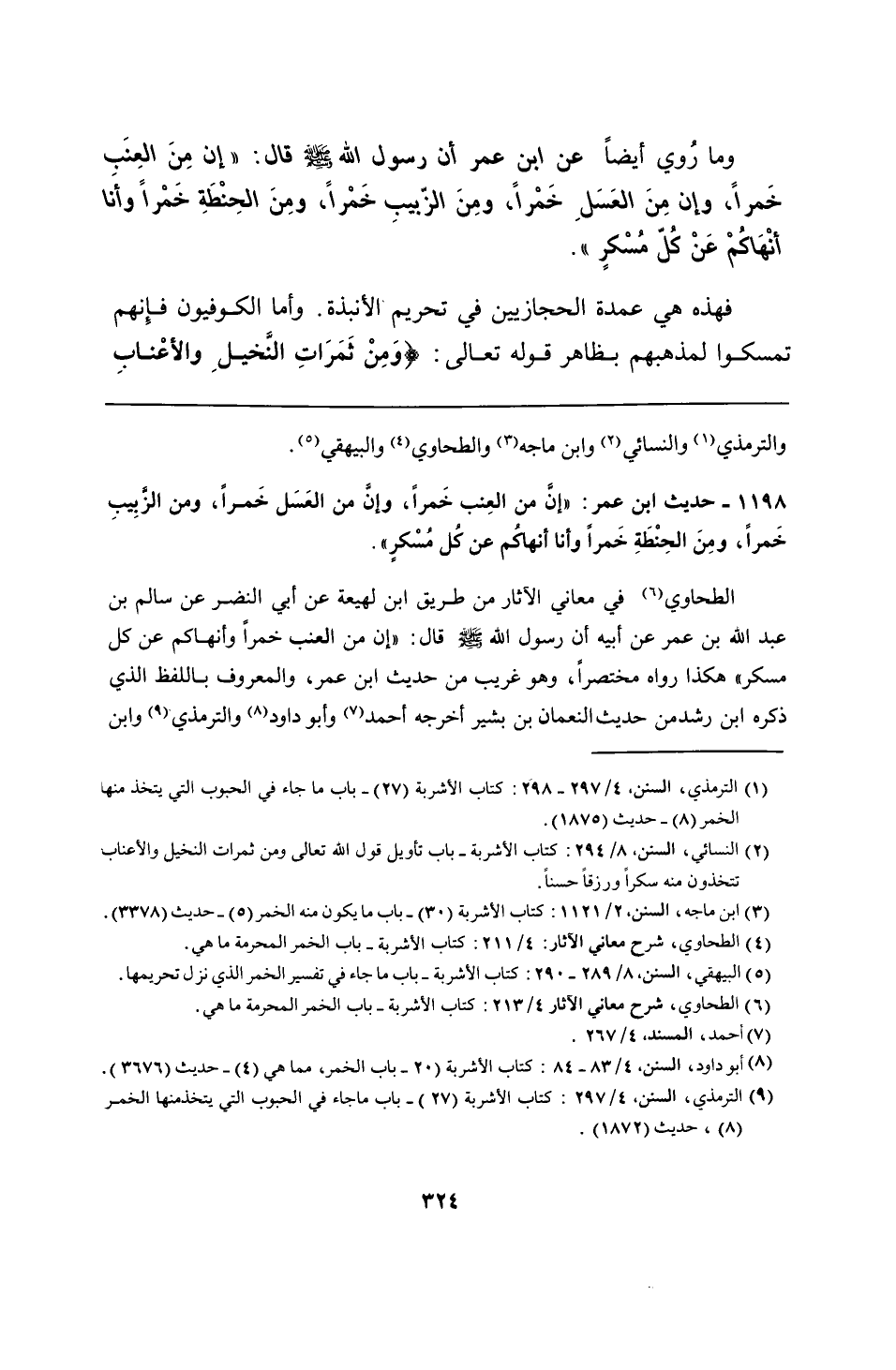 1198 - حديث ابن عمر: "إنَّ من العِنب خَمرًا، وإنَّ من العَسَل خَمرًا، ومن الزَّبِيبِ خَمرًا، ومِنَ الحِنْطَةِ خَمرًا وأنا أنهاكُم عن كُل مُسْكرٍ".