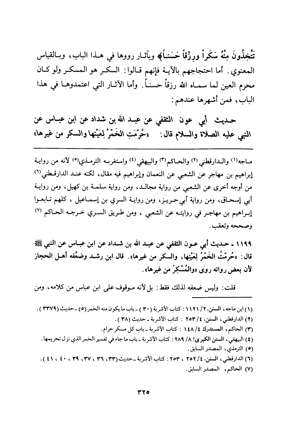 1199 - حديث أبي عون الثقفي عن عبد الله بن شداد عن ابن عباس عن النبي - صلى الله عليه وسلم - قال: "حُرمّتُ الخَمْرُ لِعَيْنِها، والسكر من غيرها". قال ابن رشد وضعَّفه أهل الحجاز لأن بعض رواته روى "والمُسْكِرُ من غيرها".