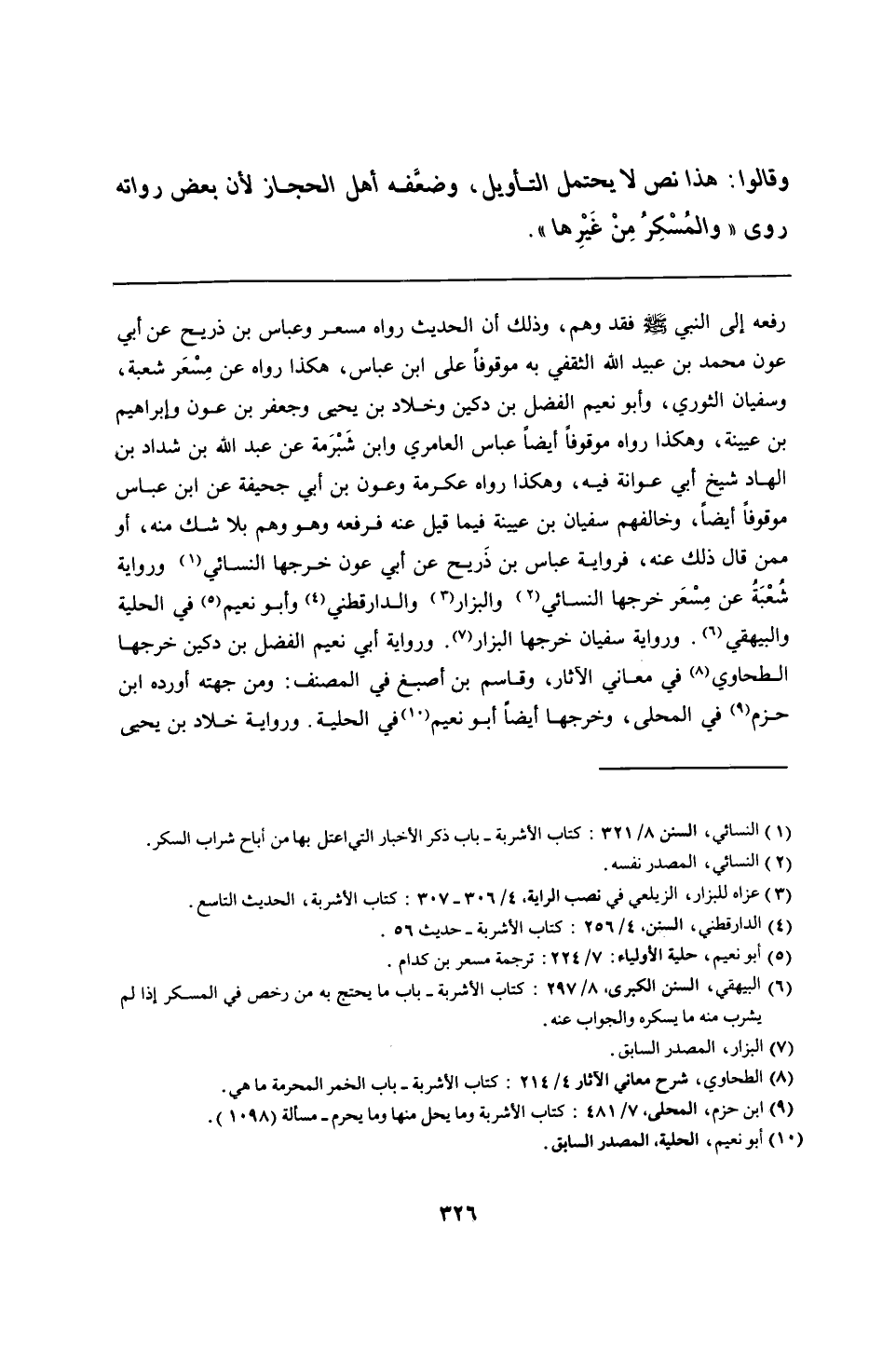 رفعه إلى النبي - صلى الله عليه وسلم - فقد وهم، وذلك أن الحديث رواه مسعر وعباس بن ذريح عن أبي عون محمد بن عبيد الله الثقفي به موقوفًا على ابن عباس، هكذا رواه عن مِسْعَر شعبة، وسفيان الثوري، وأبو نعيم الفضل بن دكين وخلاد بن يحيى وجعفر بن عون وإبراهيم بن عيينة، وهكذا رواه موقوفًا أيضًا عباس العامري وابن شَبْرَمة عن عبد الله بن شداد بن الهاد شيخ أبي عوانة فيه، وهكذا رواه عكرمة وعون بن أبي جحيفة عن ابن عباس موقوفًا أيضًا، وخالفهم سفيان بن عيينة فيما قيل عنه فرفعه وهو وهم بلا شك منه، أو ممن قال ذلك عنه، فرواية عباس بن ذَريح عن أبي عون خرجها النسائي ورواية شُعْبَةُ عن مِسْعَر خرجها النسائي والبزار والدارقطني وأبو نعيم في الحلية والبيهقي. ورواية سفيان خرجها البزار. ورواية أبي نعيم الفضل بن دكين خرجها الطحاوي في معاني الآثار، وقاسم بن أصبغ في المصنف: ومن جهته أورده ابن حزم في المحلى، وخرجها أيضًا أبو نعيم في الحلية. ورواية خلاد بن يحيي