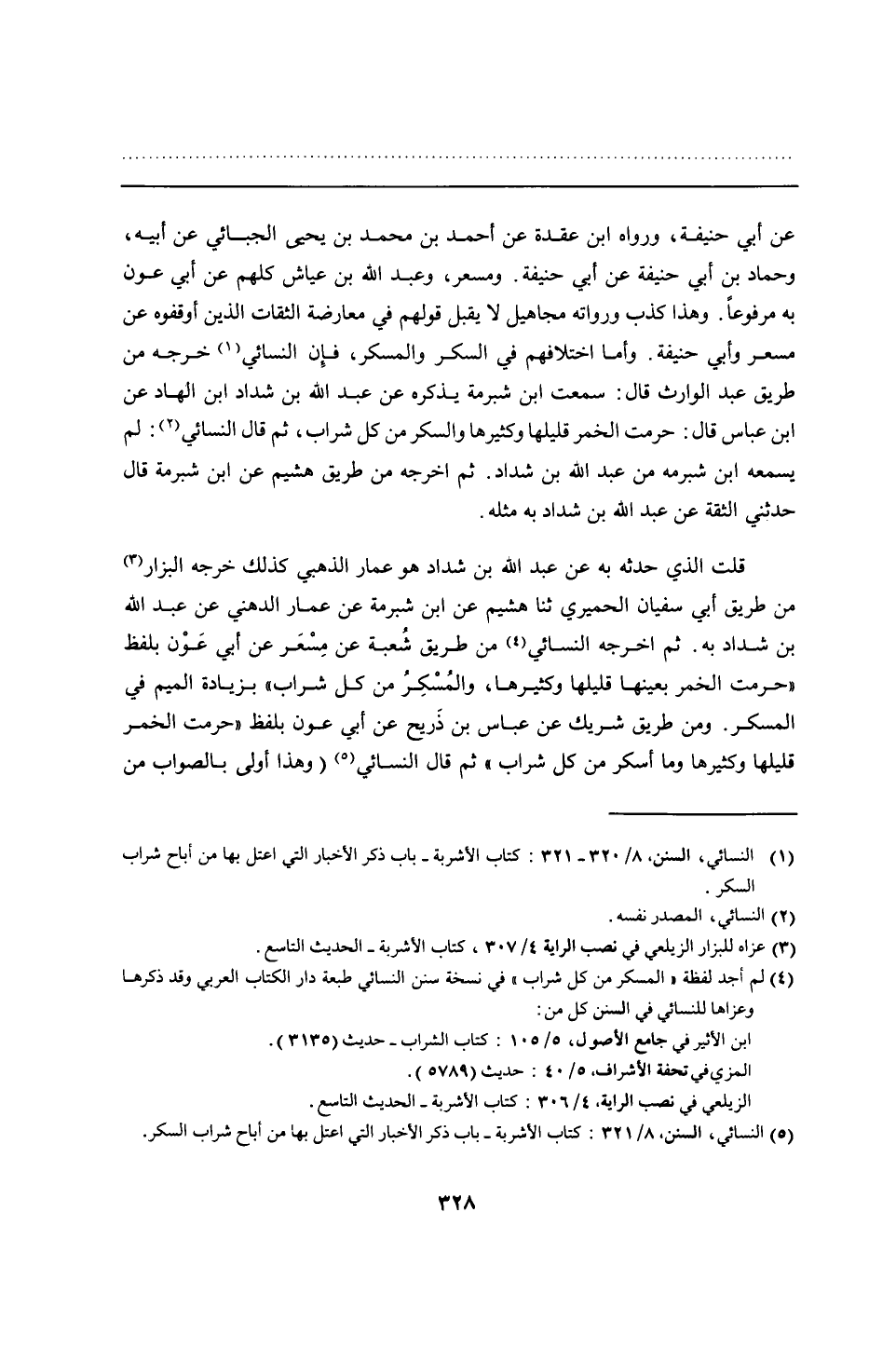 عن أبي حنيفة، ورواه ابن عقدة عن أحمد بن محمد بن يحيى الجبائي عن أبيه، وحماد بن أبي حنيفة عن أبي حنيفة. ومسعر، وعبد الله بن عياش كلهم عن أبي عون به مرفوعًا. وهذا كذب ورواته مجاهيل لا يقبل قولهم في معارضة الثقات الذين أوقفوه عن مسعر وأبي حنيفة. وأما اختلافهم في السكر والمسكر، فإِن النسائي خرجه من طريق عبد الوارث قال: سمعت ابن شبرمة يذكره عن عبد الله بن شداد ابن الهاد عن ابن عباس قال: حرمت الخمر قليلها وكثيرها والسكر من كل شراب، ثم قال النسائي: لم يسمعه ابن شبرمه من عبد الله بن شداد. ثم أخرجه من طريق هشيم عن ابن شبرمة قال حدثني الثقة عن عبد الله بن شداد به مثله.