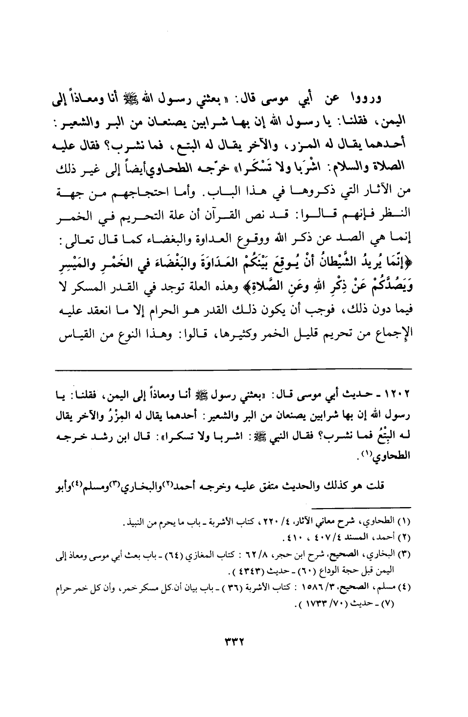 1202 - حديث أبي موسى قال: "بعثني رسول الله - صلى الله عليه وسلم - أنا ومعاذًا إلى اليمن، فقلنا: يا رسول الله إن بها شرابين يصنعان من البر والشعير: أحدهما يقال له المِزْرُ والآخر يقال له البِتْعُ فما نشرب؟ فقال النبي - صلى الله عليه وسلم -: اشربا ولا تسكرا": قال ابن رشد خرجه الطحاوي.