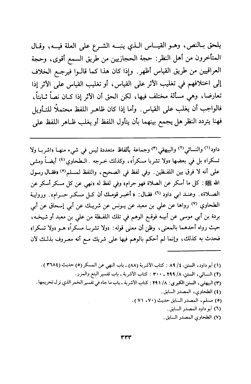 داود والنسائي والبيهقي وجماعة بألفاظ متعددة ليس في شيء منها "اشربا ولا تسكرا" بل في بعضها "ولا تشربا مسكرًا"، وكذلك خرجه. الطحاوي أيضًا ومشى على أنه لا فرق بين اللفظين. وفي لفظ في الصحيح، واللفظ لمسلم "فقال رسول الله - صلى الله عليه وسلم -: كل ما أسكر عن الصلاة فهو حرام" وفي لفظ له "نهي عن كل مسكر أسكر عن الصلاة". وعند أبي داود فقال: "أخبر قومك أن كل مسكر حرام". ورواية الطحاوي رواها عن علي بن معبد عن يونس عن شريك عن أبي إسحاق عن أبي بردة بن أبي موسى عن أبيه فوقع الوهم في تلك اللفظة من علي بن معبد أو شيخه، حيث رواه أحدهما بالمعنى، وظن أن معنى قوله: "ولا تشربا مسكرًا" هو "ولا تسكرا" فحدث به كذلك، وإنما لم أحكم بالوهم فيها على شريك مع أنه معروف بذلك لأن