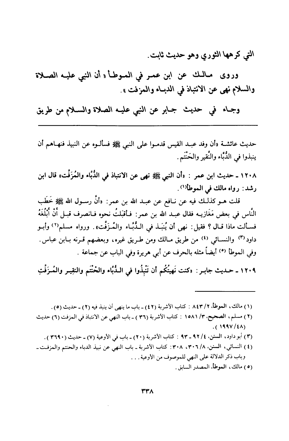 1208 - حديث ابن عمر: "أن النبي - صلى الله عليه وسلم - نهى عن الانتباذ في الدُّبَّاء والمُزَفَّت" قال ابن رشد: رواه مالك في الموطأ.
