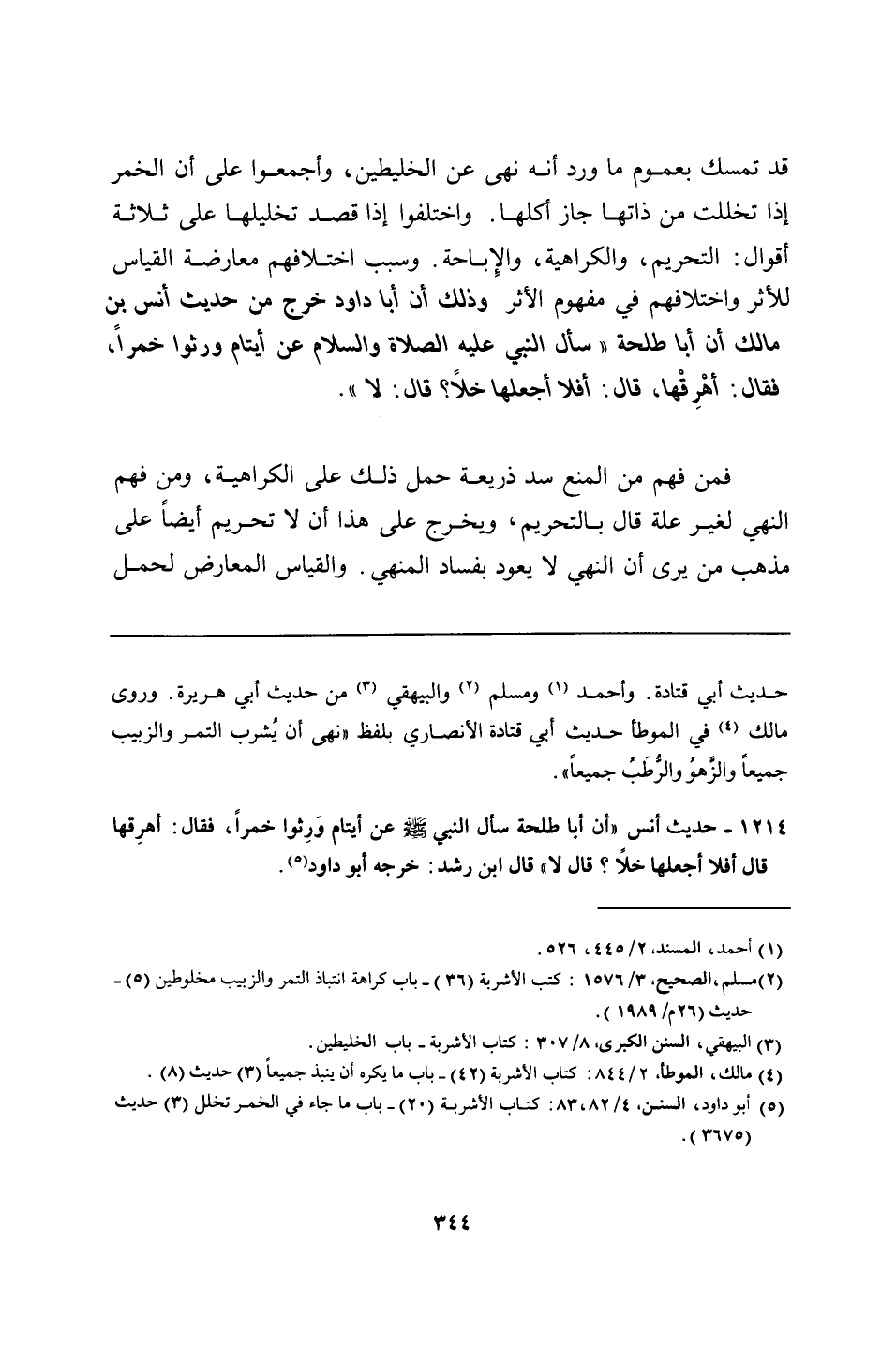 1214 - حديث أنس "أن أبا طلحة سأل النبي - صلى الله عليه وسلم - عن أيتام وَرِثوا خمرًا، فقال: أهرِقها قال أفلا أجعلها خلًا؟ قال لا" قال ابن رشد: خرجه أبو داود.