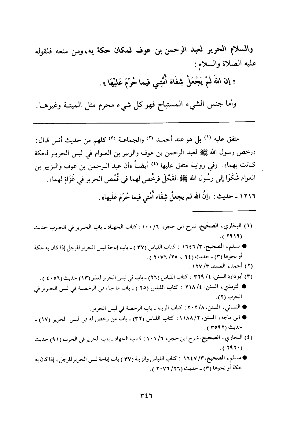 متفق عليه بل هو عند أحمد والجماعة كلهم من حديث أنس قال: "رخص رسول الله - صلى الله عليه وسلم - لعبد الرحمن بن عوف والزبير بن العوام في لبس الحرير لحكة كانت بهما". وفي رواية متفق عليها أيضًا "أن عبد الرحمن بن عوف والزبير بن العوام شَكَوَا إلى رسُول الله - صلى الله عليه وسلم - القَحْلَ فرخَّص لهما في قُمُص الحرير في غَزَاةٍ لهما".