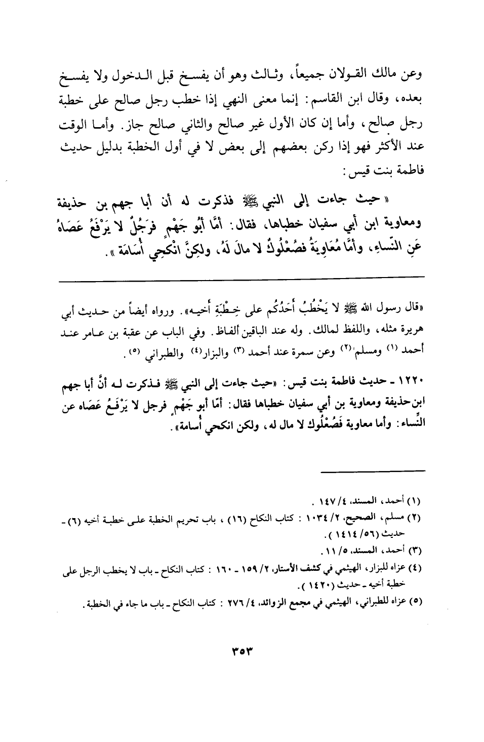 1220 - حديث فاطمة بنت قيس: "حيث جاءت إلى النبي - صلى الله عليه وسلم - فذكرت له أنَّ أبا جهم ابن حذيفة ومعاوية بن أبي سفيان خطباها فقال: أمّا أبو جَهْمٍ فرجل لا يَرْفَعُ عَصَاه عن النِّساء: وأما معاوية فَصُعْلُوك لا مال له، ولكن انكحي أُسامة".